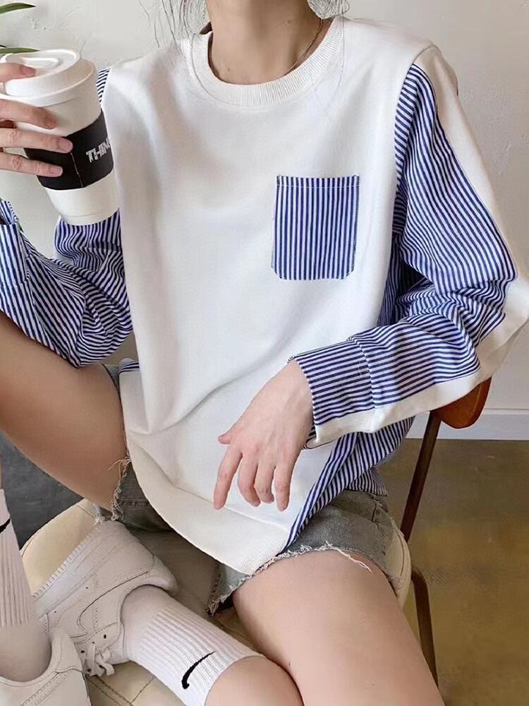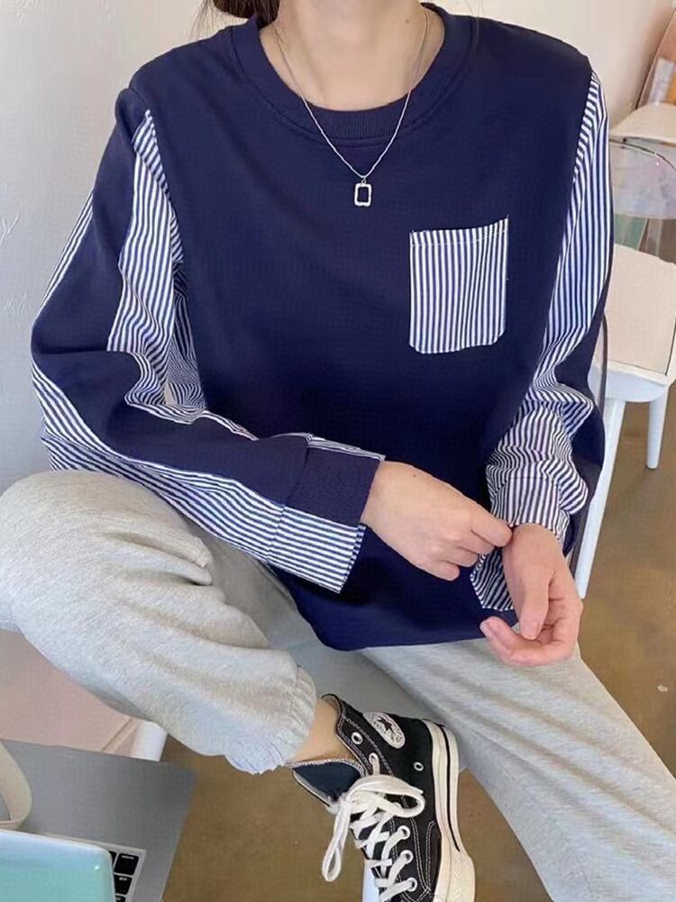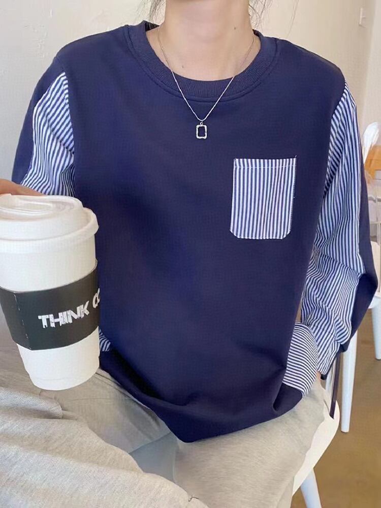[EWQ] レトロストライプパッチ長袖スウェット O ネックポケットスプライシングルーズプルオーバートップ秋冬 16U3766 ロング シャツ オータム 秋物 ウィンター 冬物 Oネック