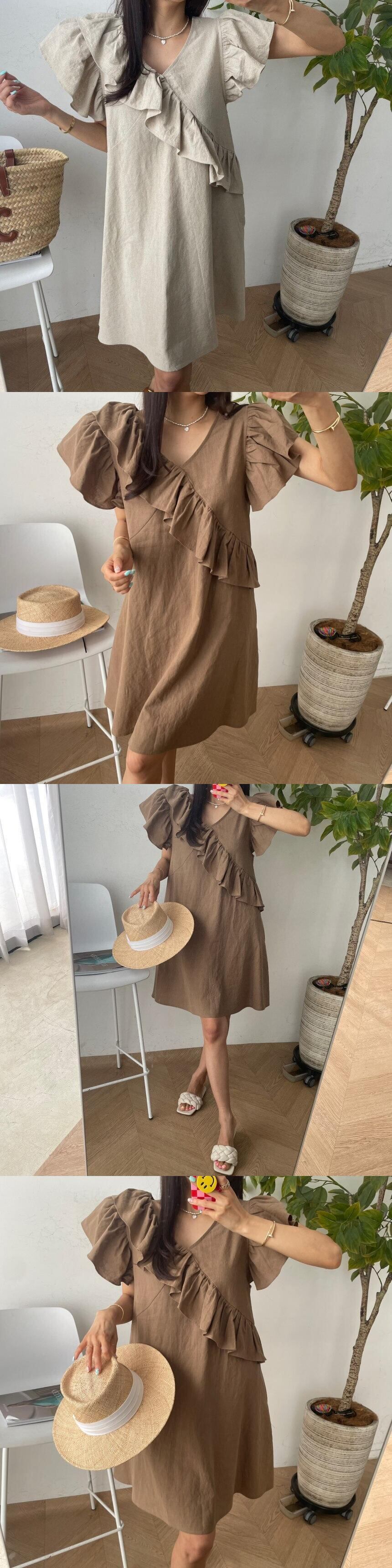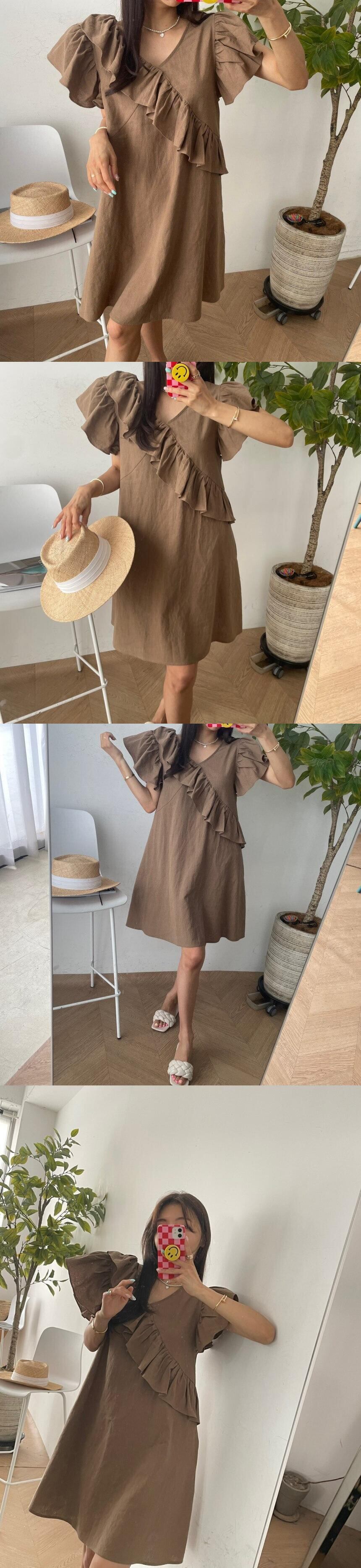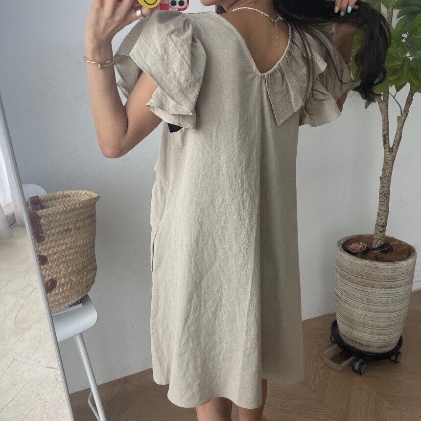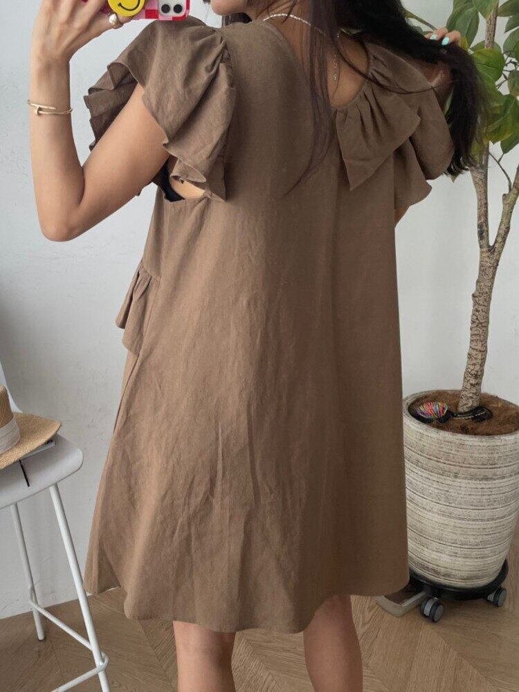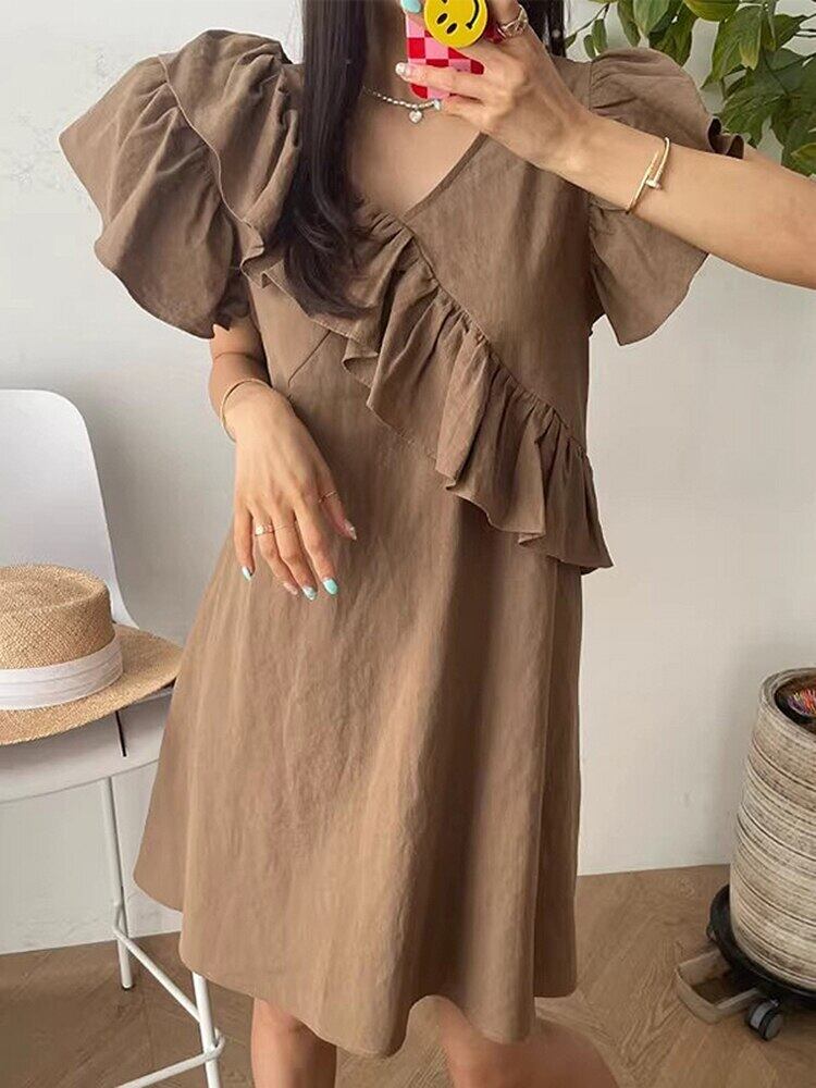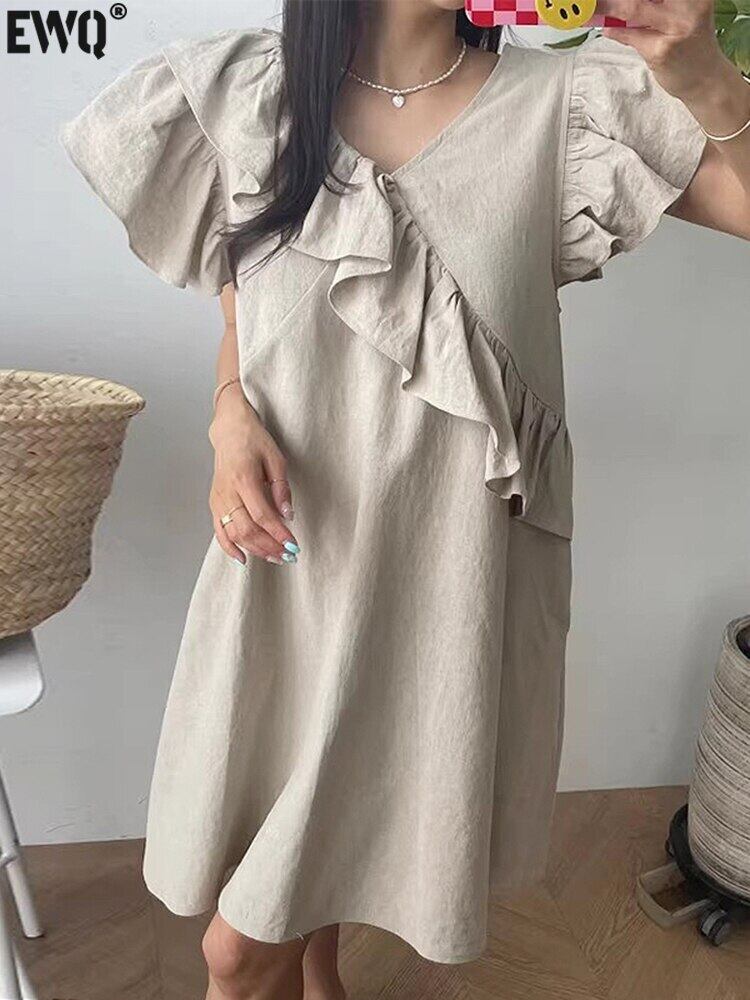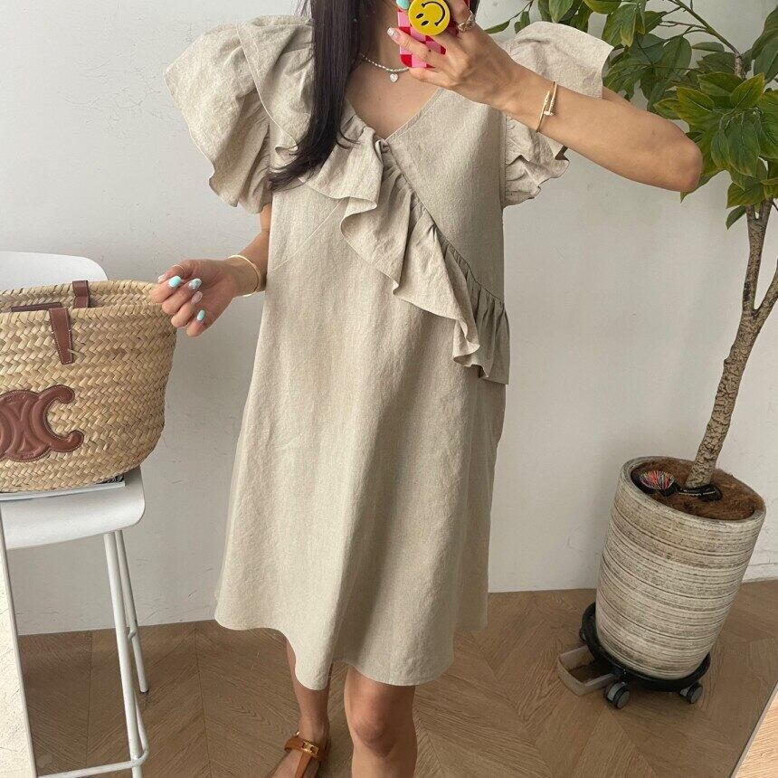 [EWQ] シック V ネックフリルパッチワークドレスルーズパフスリーブドレス夏トレンド 16O368 ラッフル サマー 夏物 Vネック
