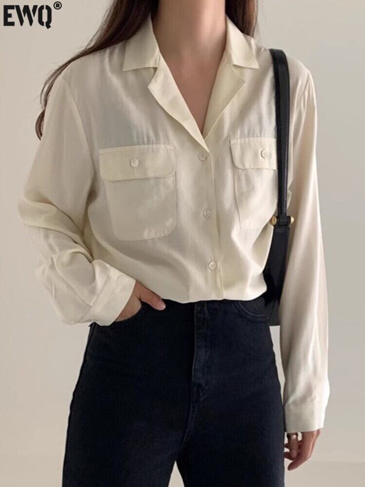 [EWQ] ダブルポケットシャツ長袖シングルブレストルーズブラウス秋潮トップ ロング オータム 秋物