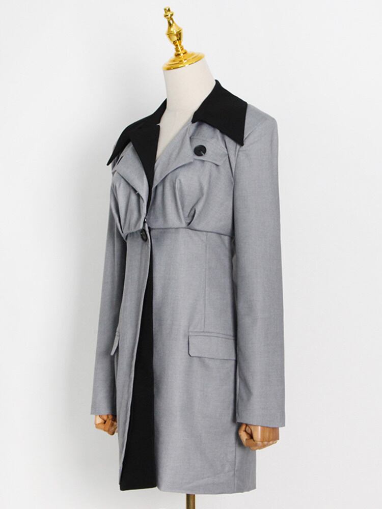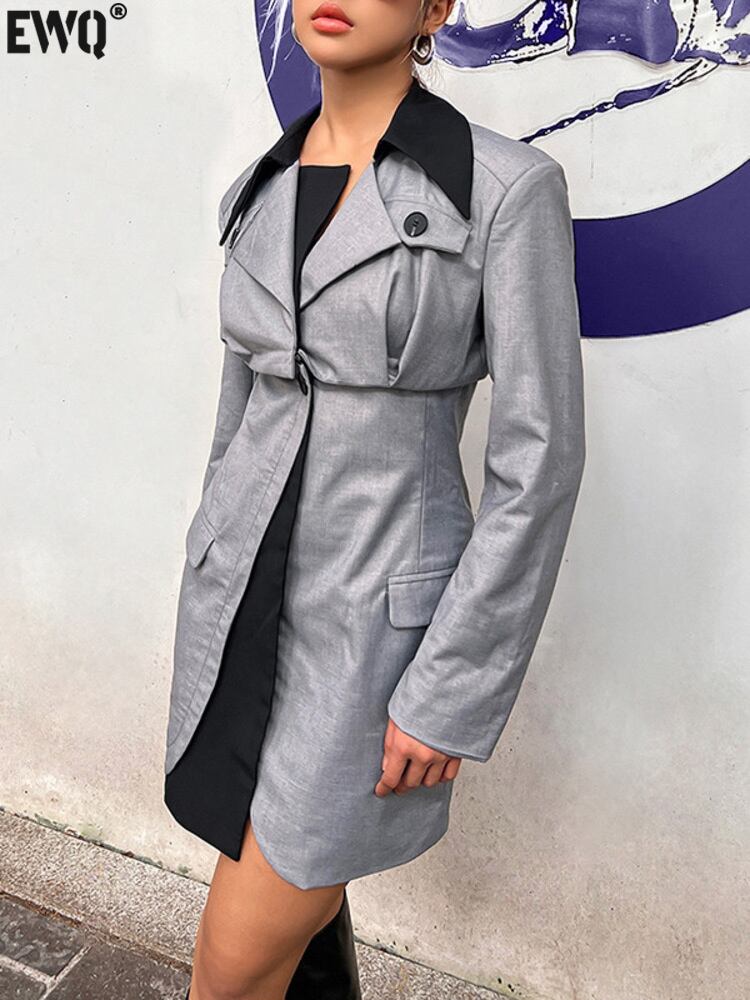 [EWQ] パッチワークコントラストブレザーノッチ気質長袖スーツジャケット秋潮スリムブレザー ロング オータム 秋物