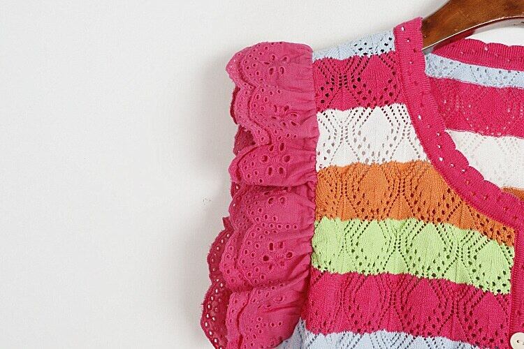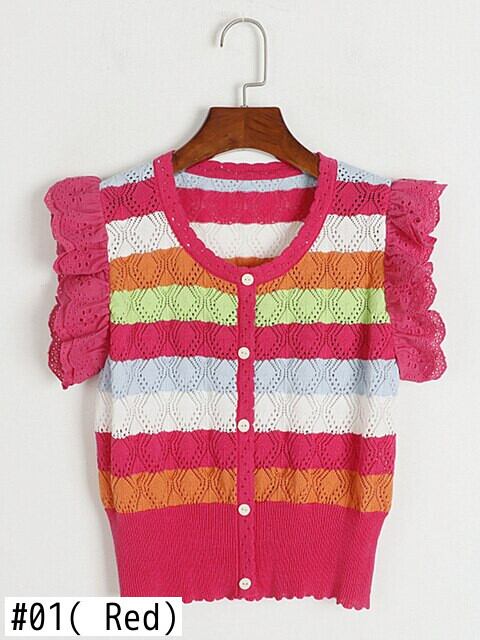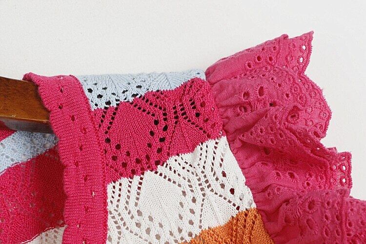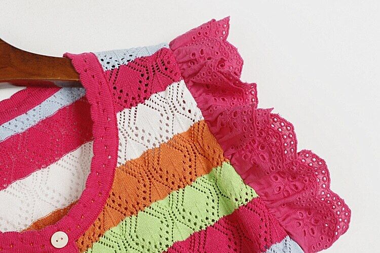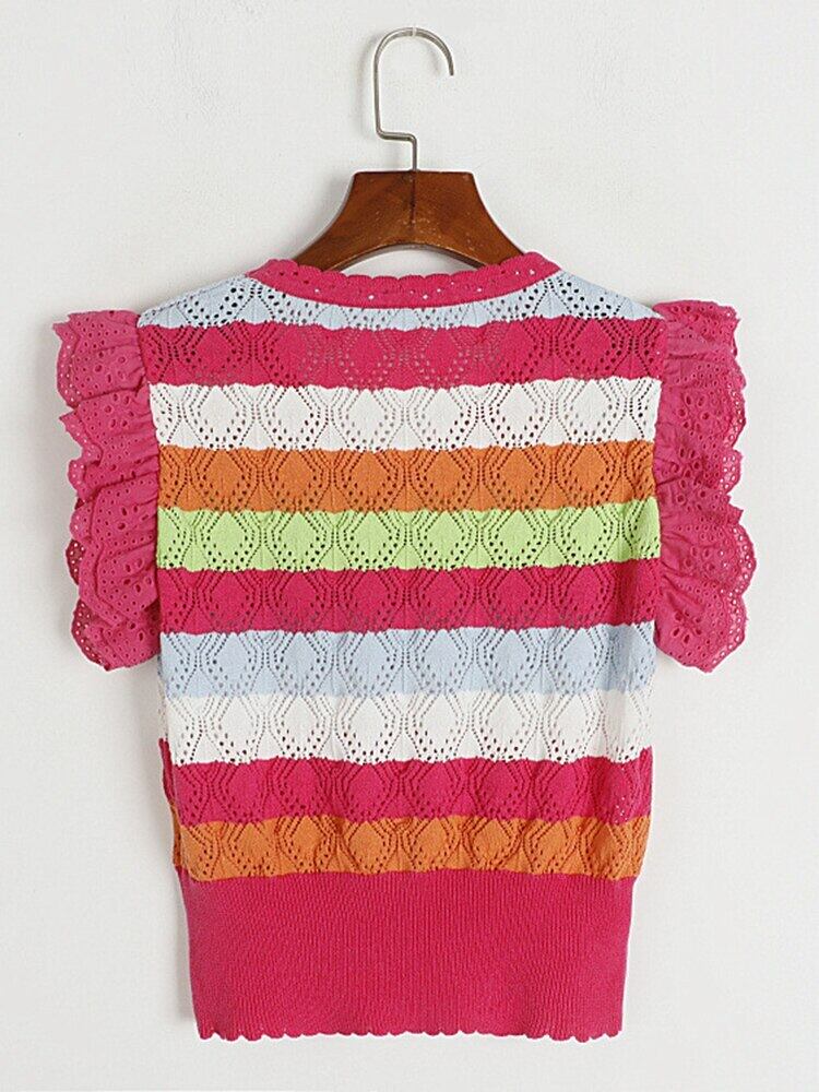 [EWQ] レーススプライシングスリーブニットベストストライプコントラスト O ネックセータータンクトップサマーニットチョッキ 494 夏物 Oネック
