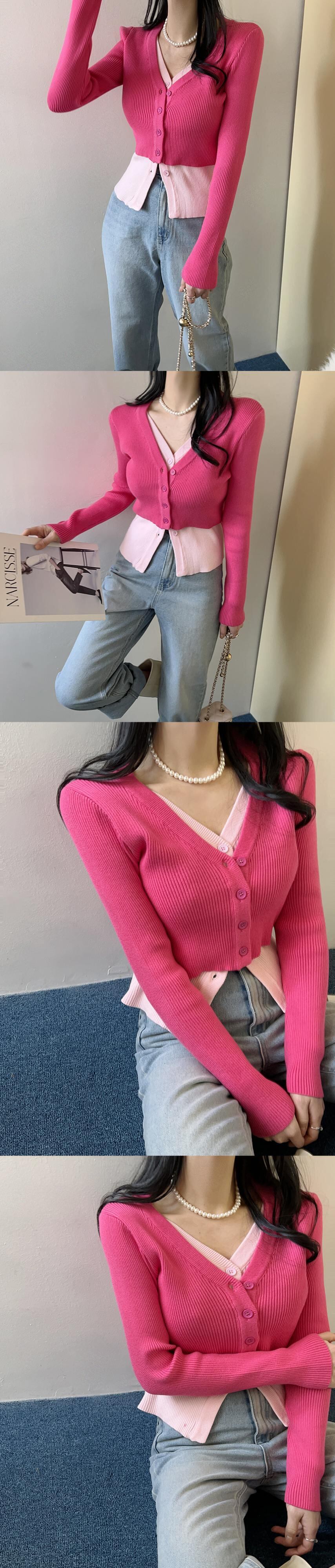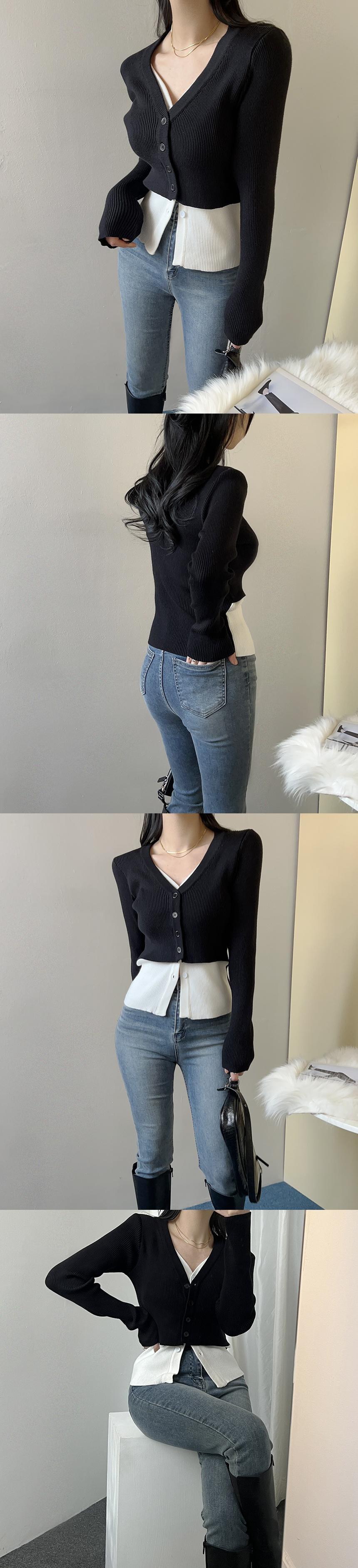 [EWQ] フェイクツーピースカーディガンコート長袖 V ネックパッチワークセータージャケット秋潮ニットコート ロング オータム 秋物 Vネック