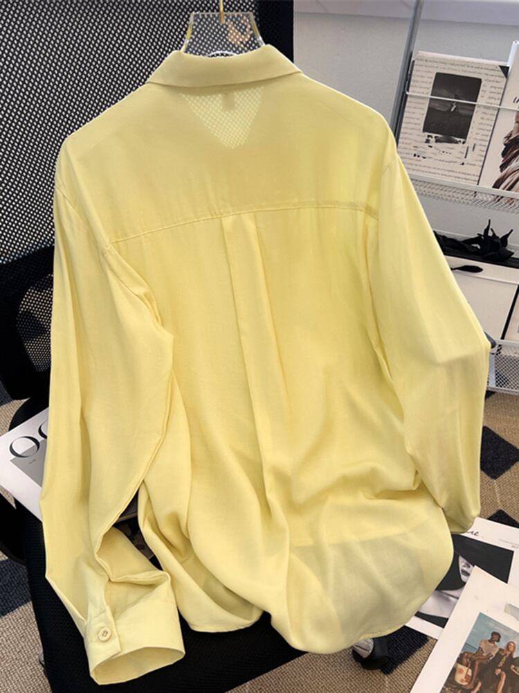 [EWQ] 巾着プリーツ長袖シャツラペルイエロールーズブラウス秋潮シックトップス ロング オータム 秋物