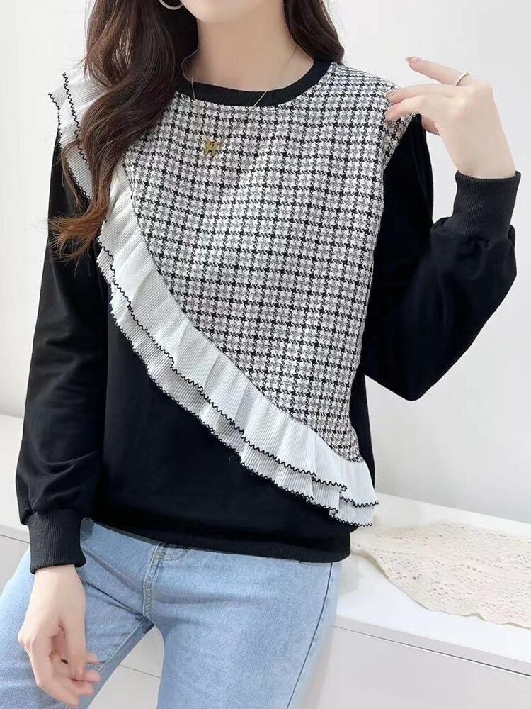 [EWQ] ランタンスリーブ菌パッチワークスウェットシャツ O ネックチェック柄非対称コントラストプルオーバー秋冬 6U4063 オータム 秋物 ウィンター 冬物 Oネック