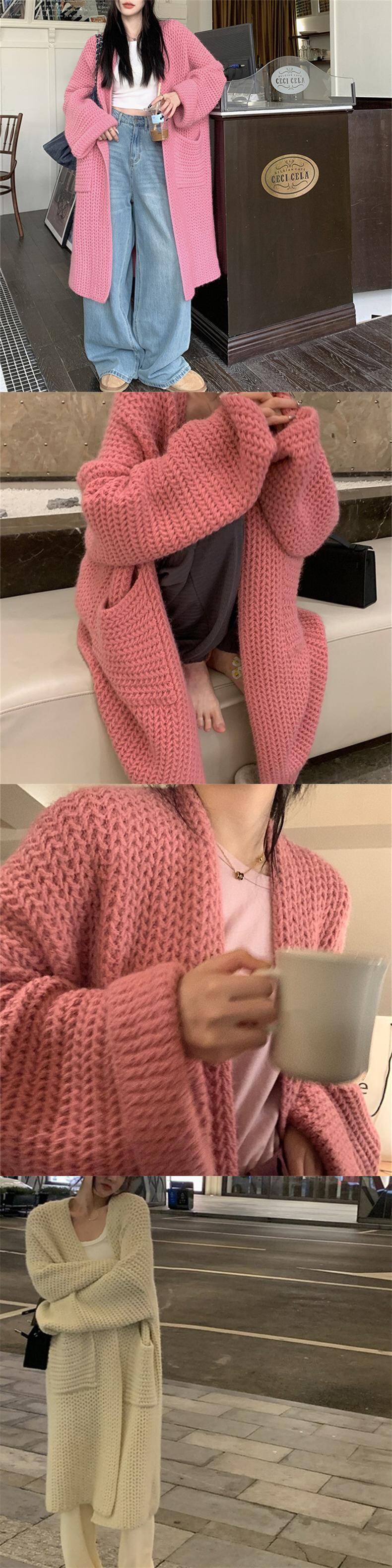 [EWQ] ポケットスプライシングカーディガンコート長袖ルーズ丈セータージャケット秋潮ニットコート ロング オータム 秋物