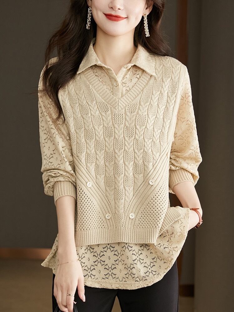 [EWQ] フックフラワーニットパッチワークシャツビッグサイズルーズ長袖セーター秋薄い潮服 ロング オータム 秋物 フラワーデザイン
