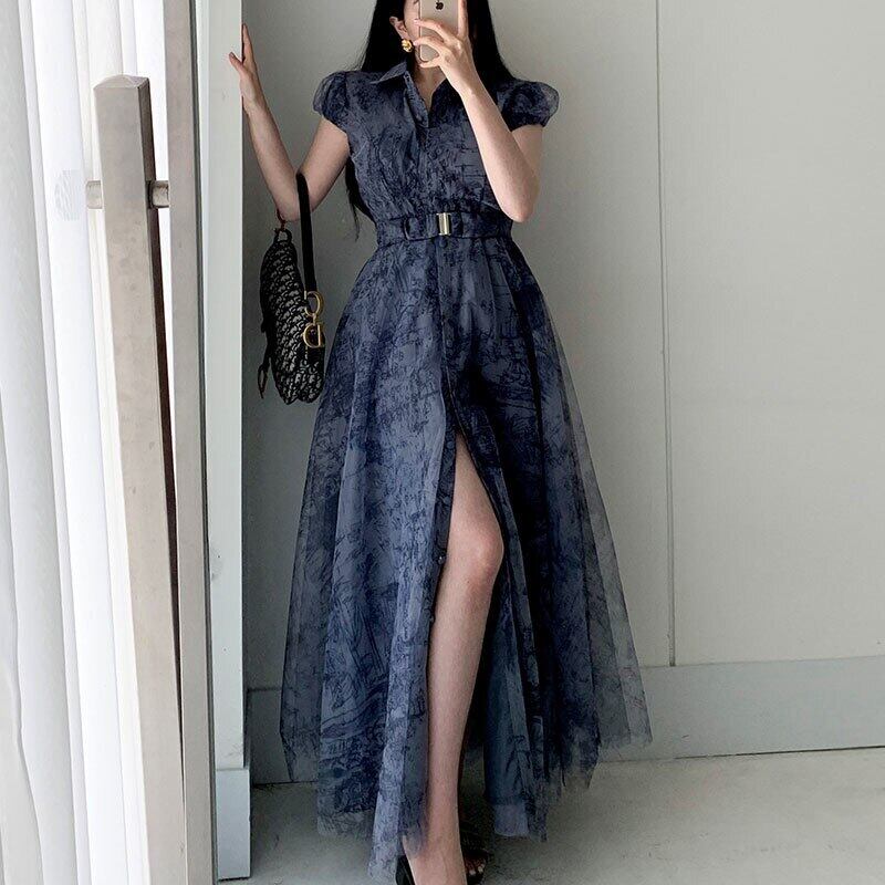 [EWQ] シック美しいドレスシングルブレストインクハロー染めスプリットメッシュドレス Vestidos 秋 16O02209 オータム 秋物