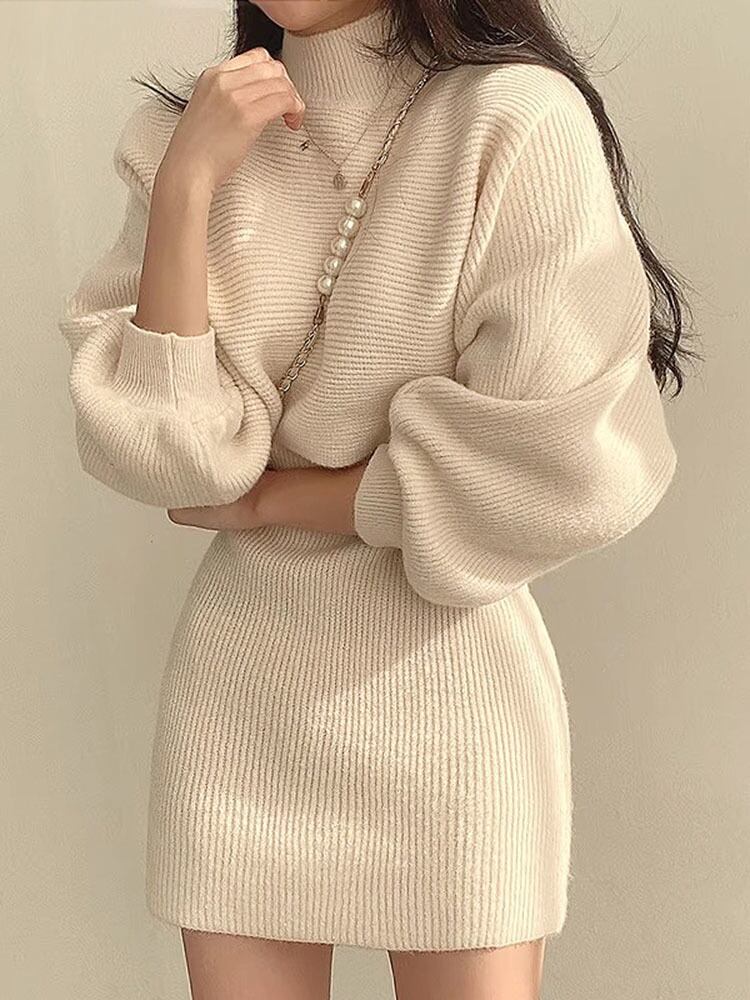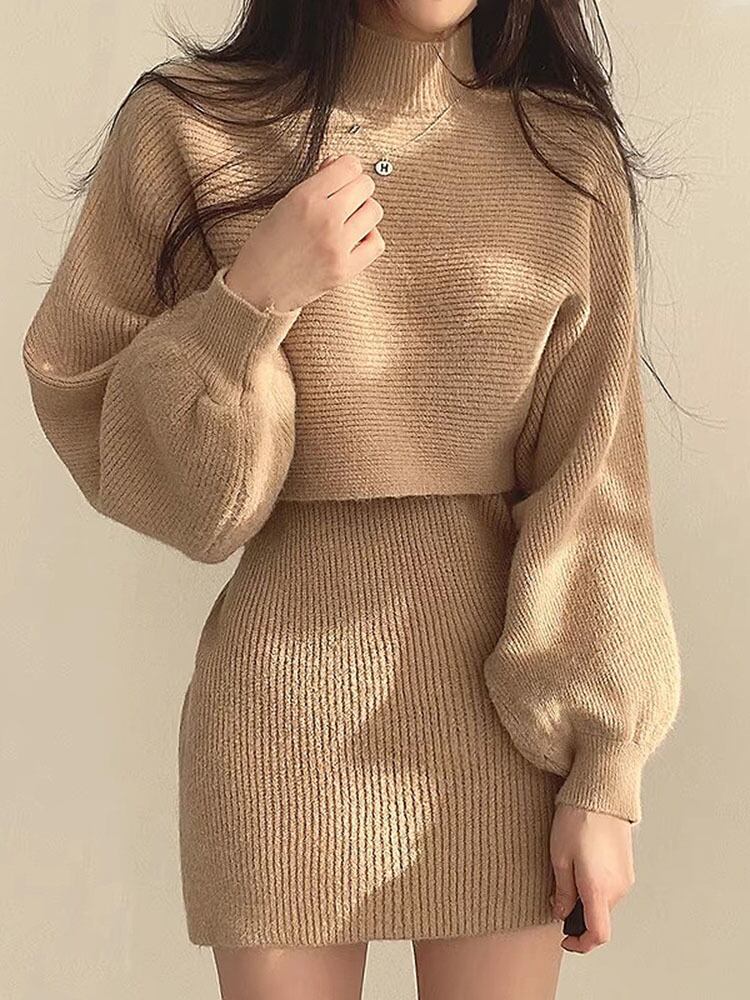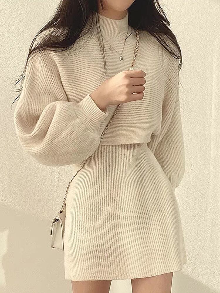 [EWQ] シックタートルネックランタンスリーブセータープルオーバー+ミニニットドレス秋ニット2点セット オータム 秋物