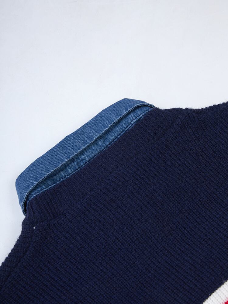 [EWQ] ストライプデニムパッチワークセータールーズ長袖フェイクツーピースプルオーバーニット秋潮トップ ロング オータム 秋物