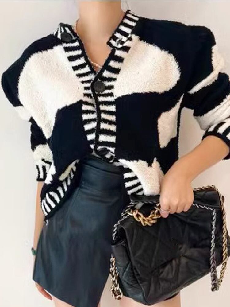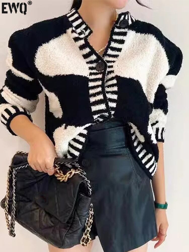 [EWQ] ブラックホワイトコントラストカーディガンコート長袖シングルブレストルーズセータージャケット秋冬服 ロング オータム 秋物 ウィンター 冬物