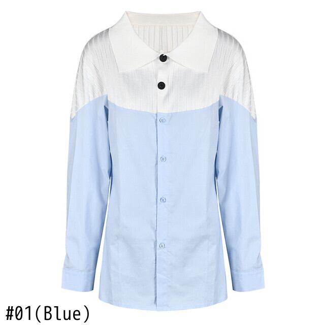 [EWQ] 長袖コントラストカラーパッチワークシャツニットスプライシングブルーブラウス秋 16O219 ロング オータム 秋物