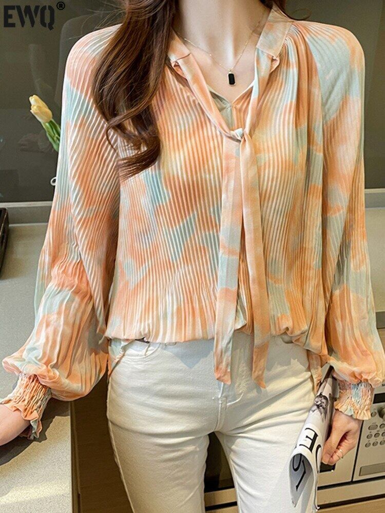 [EWQ] タイダイコントラストシャツランタンスリーブルーズスタンドレースアッププリーツ秋潮トップ オータム 秋物