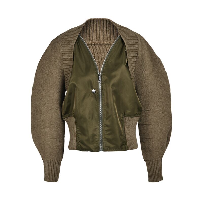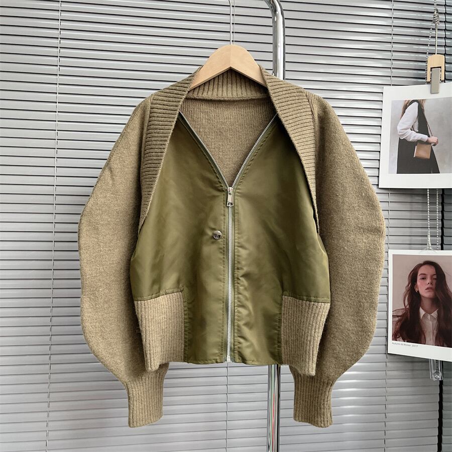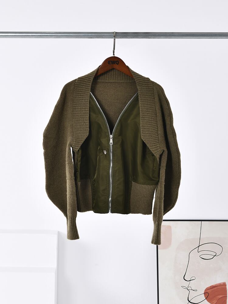 [EWQ] ニットスプライスフェイクツーピースコートパッチワークボンバージャケットトレンドアウタートップス冬秋 オータム 秋物 ウィンター 冬物