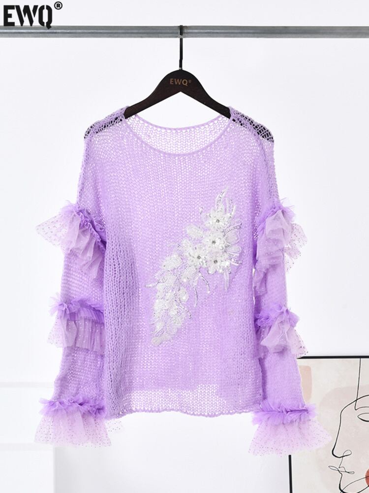 [EWQ] スパンコール 3D フラワーパープルセーター O ネックルーズプルオーバーニット長袖薄手服秋冬 16O502 ロング オータム 秋物 ウィンター 冬物 Oネック フラワーデザイン