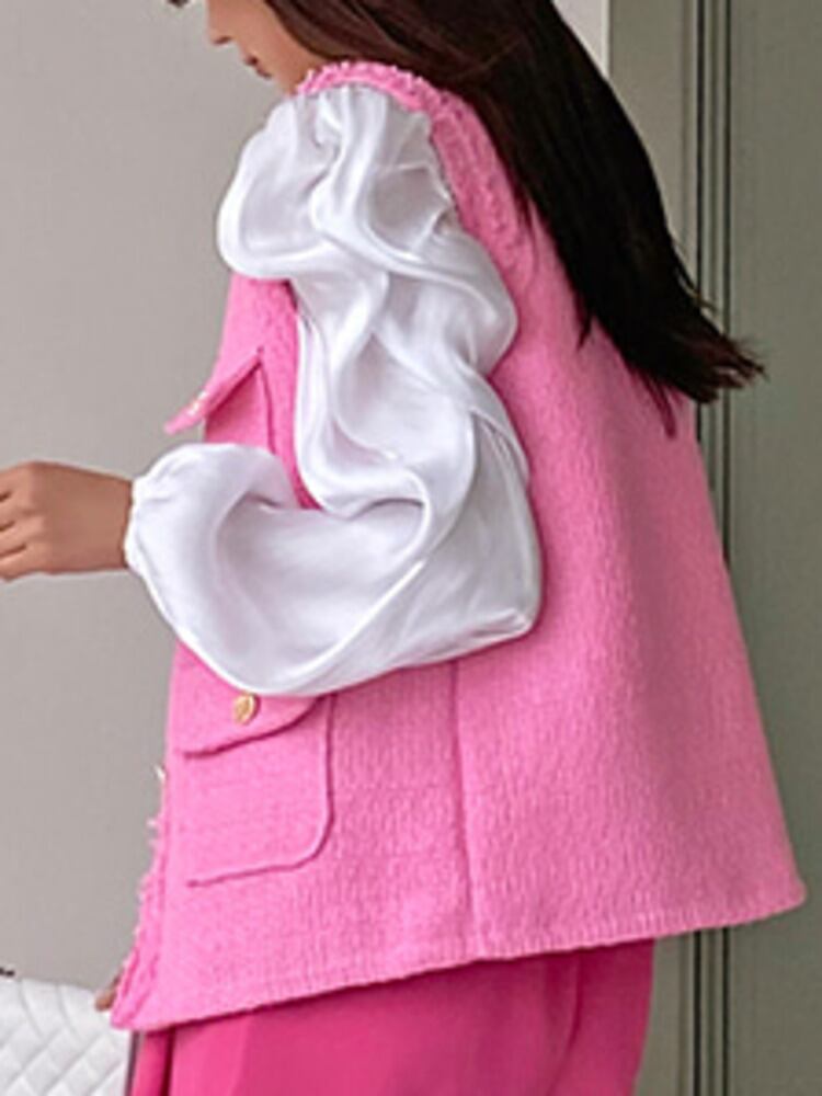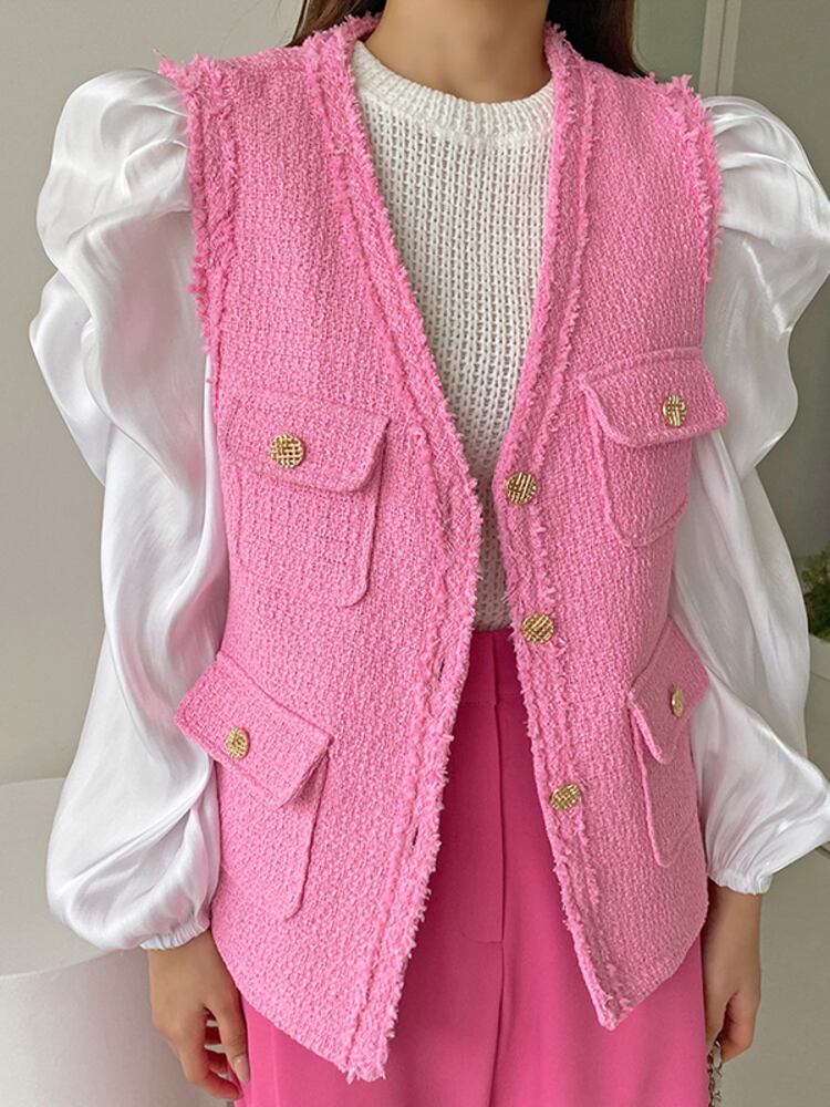 [EWQ] 甘いメタルボタンツイードベストポケットスプライスピンクノースリーブジャケット秋冬潮トップス 16U3729 大人ガーリー スウィート キュート カジュアル オータム 秋物 ウィンター 冬物