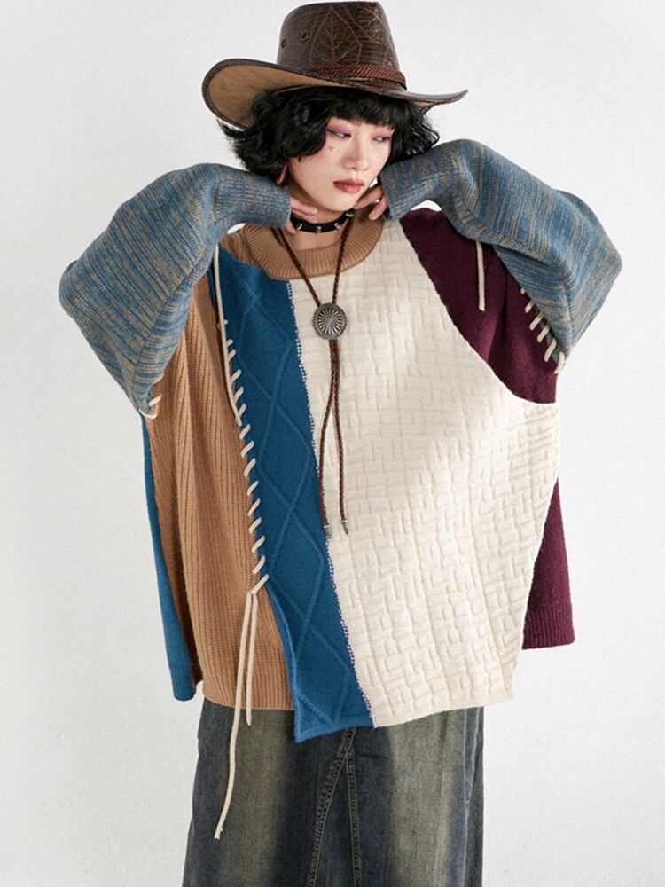 [EWQ] コントラストセーター長袖ライン装飾パッチワークプルオーバーニットトップ秋潮ニットトップス ロング オータム 秋物