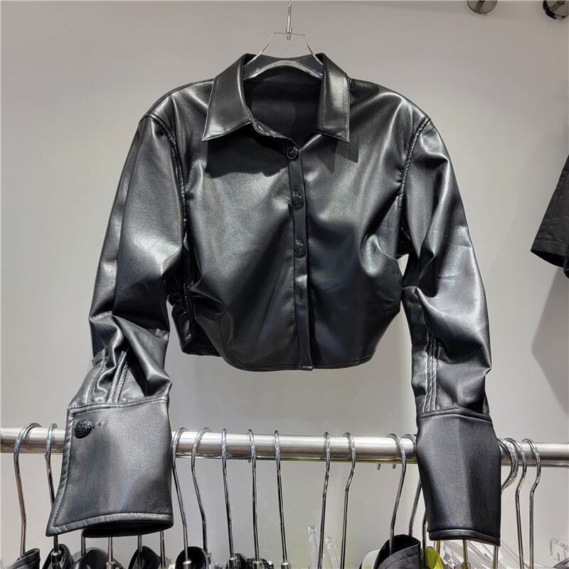 [EWQ] モーターストーム裾非対称 PU レザージャケット長袖カーキショートジャケット秋冬 16U3972 ロング オータム 秋物 ウィンター 冬物