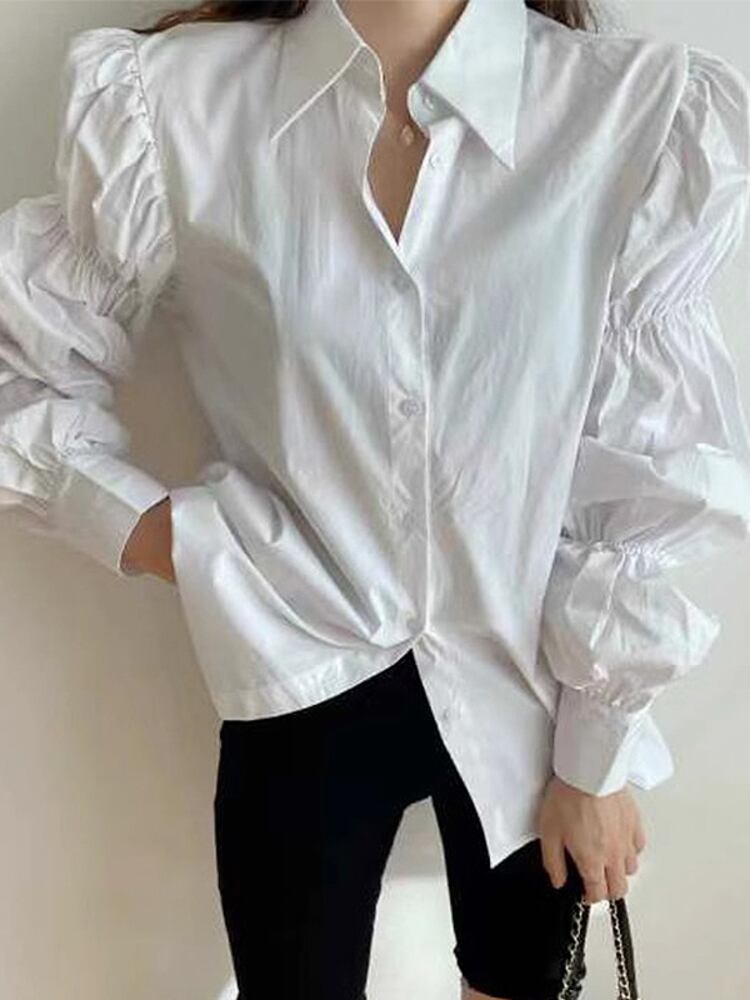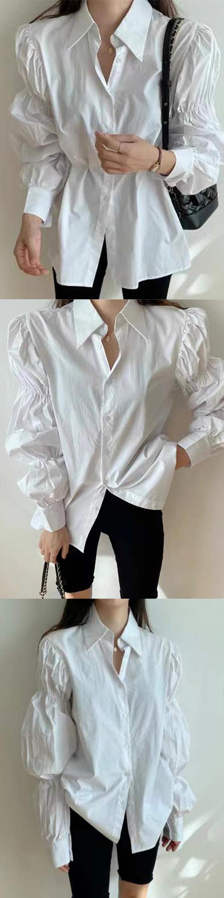 [EWQ] ランタンスリーブ白シャツシングルブレストオフィスレディゆったり秋冬潮服 3590 ホワイト オータム 秋物 ウィンター 冬物 会社 学校 通勤や通学にも