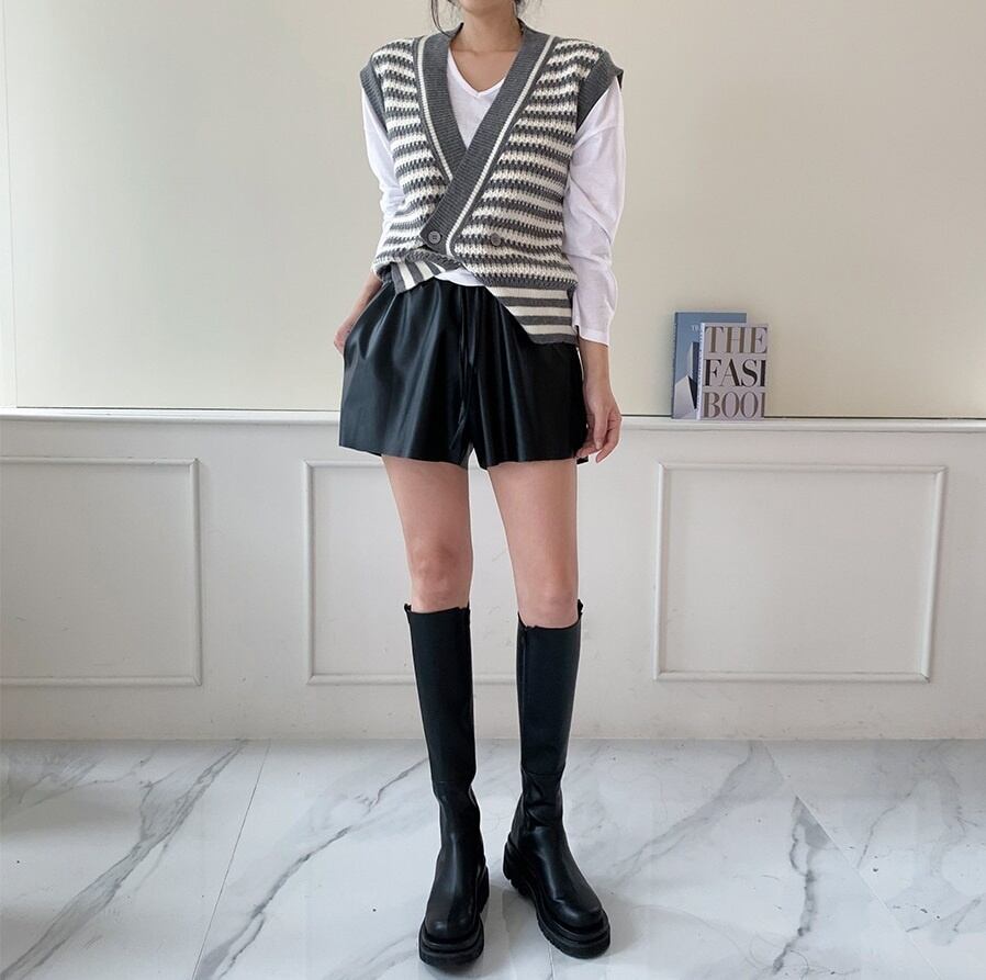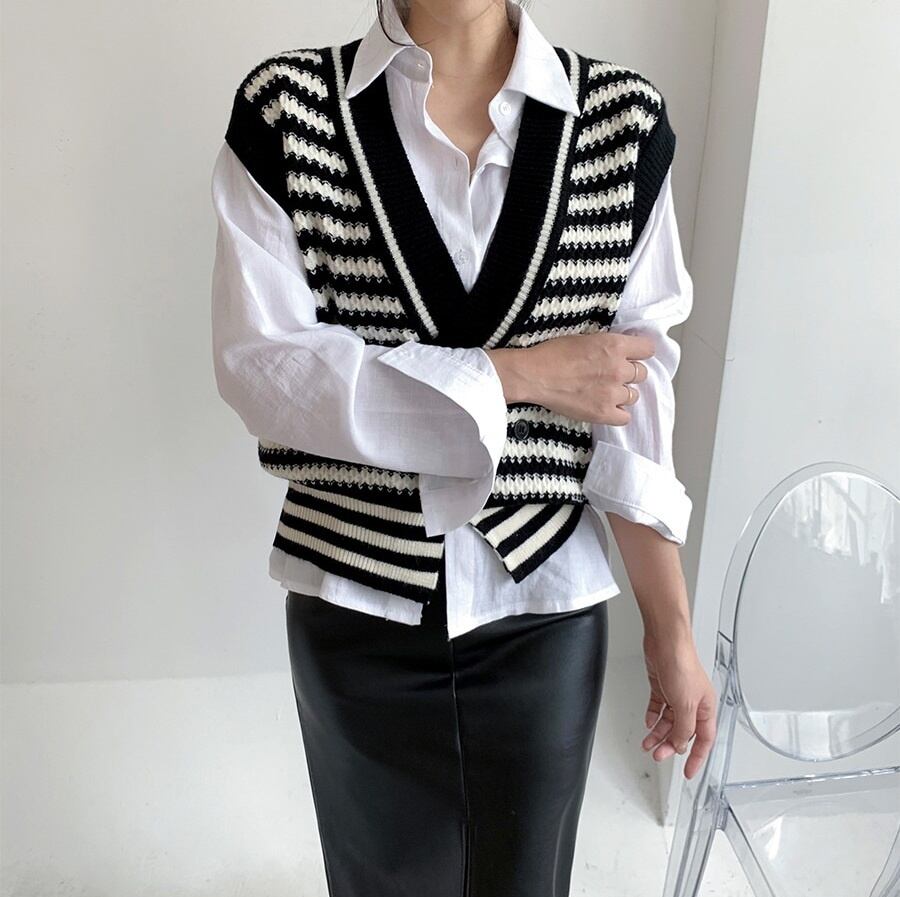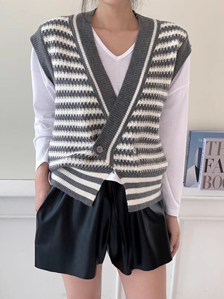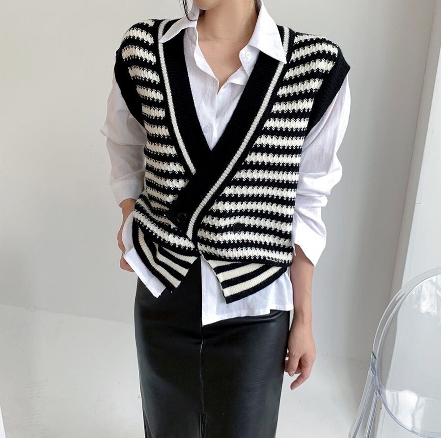 [EWQ] ストライプコントラストセーターベスト V ネック 1 ボタンルーズニットタンク秋潮ノースリーブニットトップ U3312 オータム 秋物 Vネック