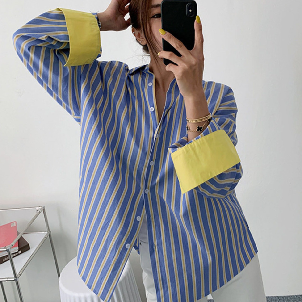 [EWQ] シックコントラストストライプシャツトレンドルーズ長袖シャツルーズトップ秋ブラウス 16E1950 ロング オータム 秋物