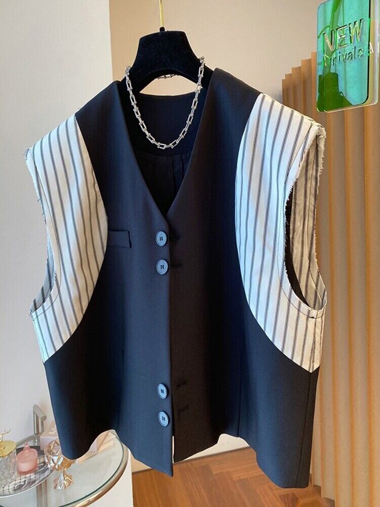 [EWQ] ストライプコントラストパッチワークベストシングルブレストノースリーブジャケット夏潮チョッキトップ サマー 夏物