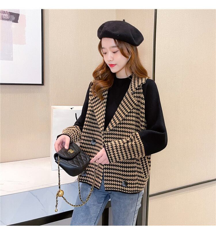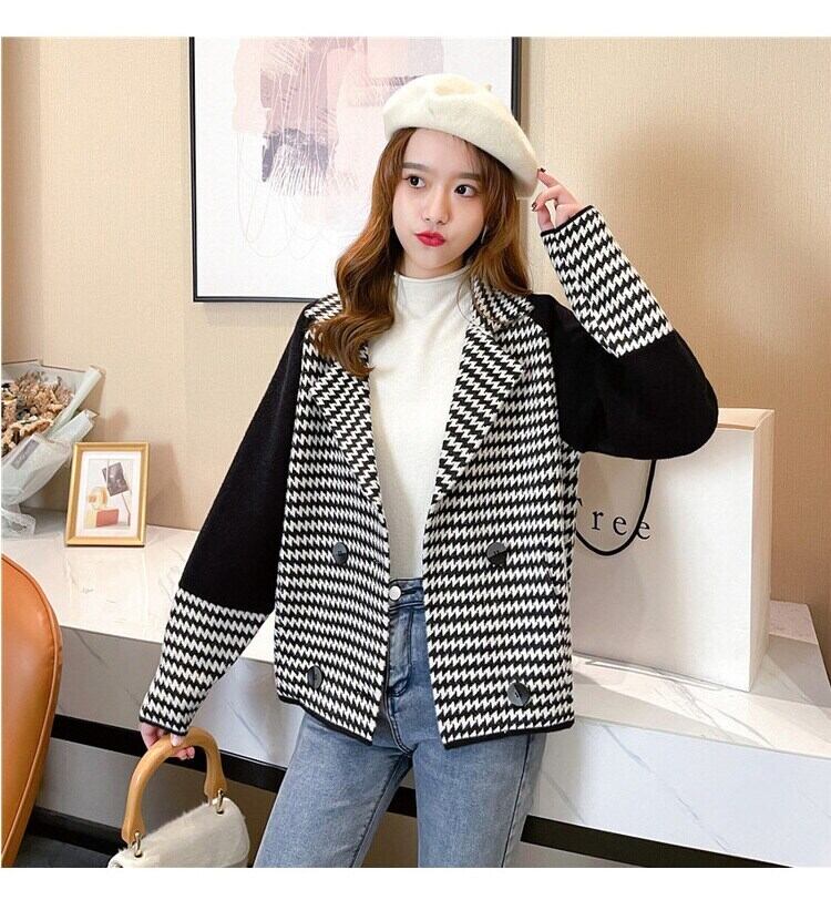 [EWQ] チェック柄パッチワークニットコート長袖ダブルブレストルーズジャケット秋冬アウター 16U355904 ロング オータム 秋物 ウィンター 冬物