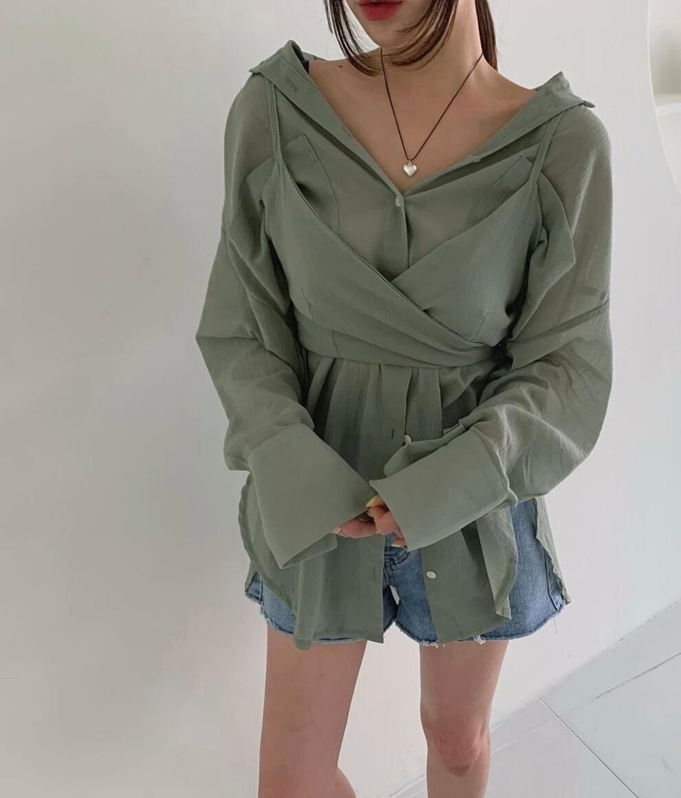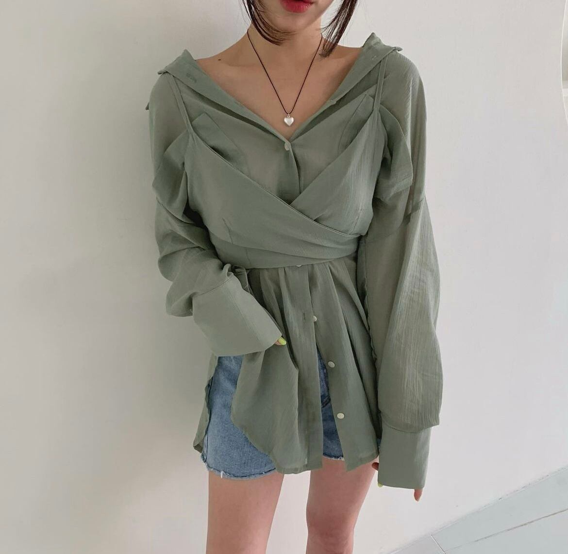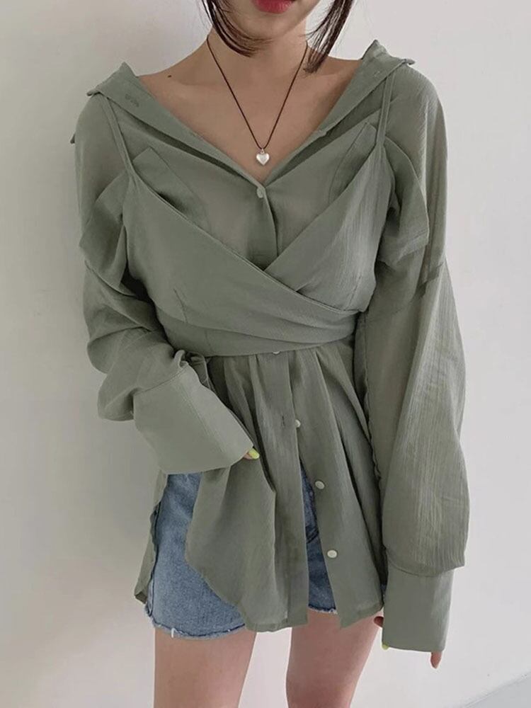 [EWQ] 秋ラペル長袖シングルブレストルーズ無地シャツ + V ネックサスペンダートップス 2 点セット ロング オータム 秋物 Vネック ソリッドカラー