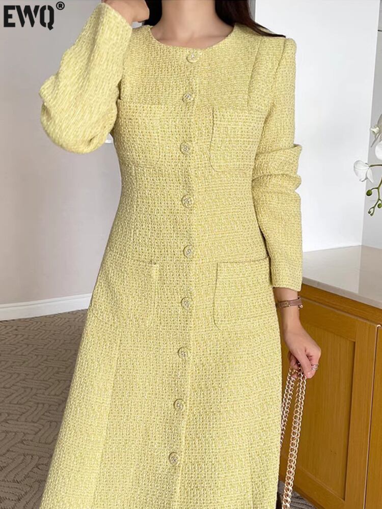 [EWQ] 複数ポケットツイードドレス長袖シングルブレストパーティードレス Vestido 秋冬 16U4248 ロング オータム 秋物 ウィンター 冬物