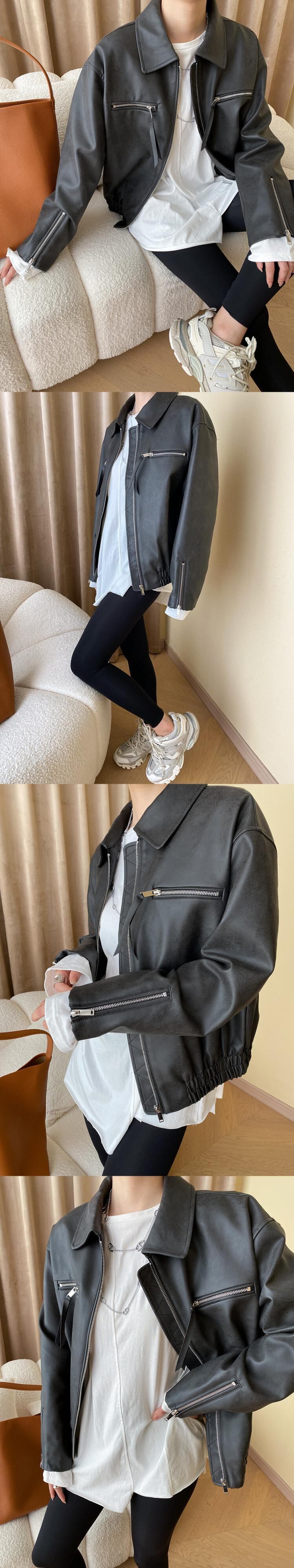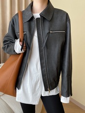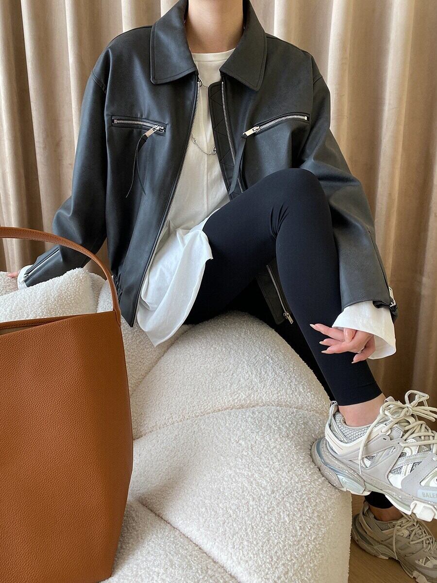 [EWQ] ジッパー装飾長袖 PU レザージャケットルーズジップアップジャケットコート秋潮生き抜く ロング オータム 秋物