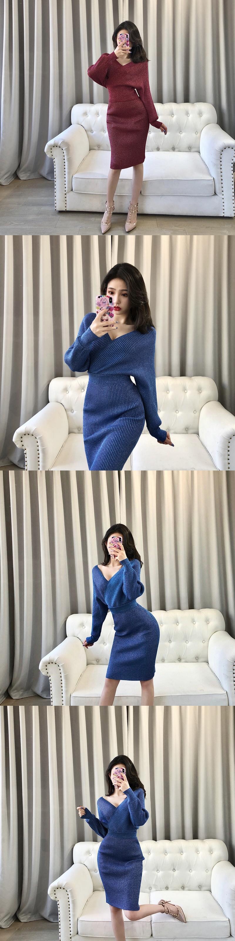 [EWQ] 黒セクシーニットツーピーススーツランタンスリーブセーター + ウエスト弾性スリムニットスカート秋潮セット ブラック エラスティック 伸縮 オータム 秋物