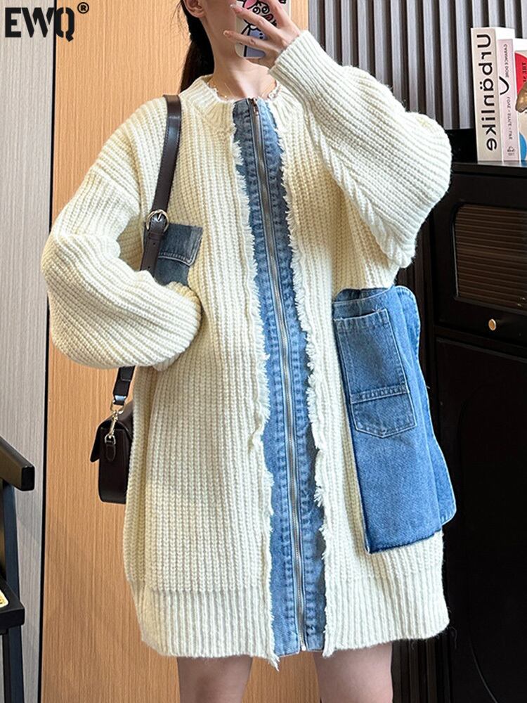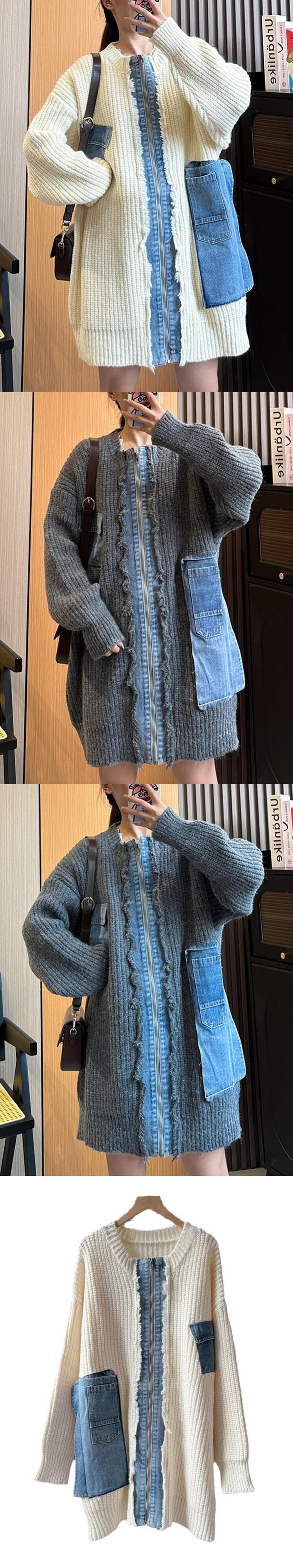 [EWQ] デニムパッチワークセーターカーディガンジャケット長袖ジッパールーズコートトップス秋 16O483 ロング オータム 秋物