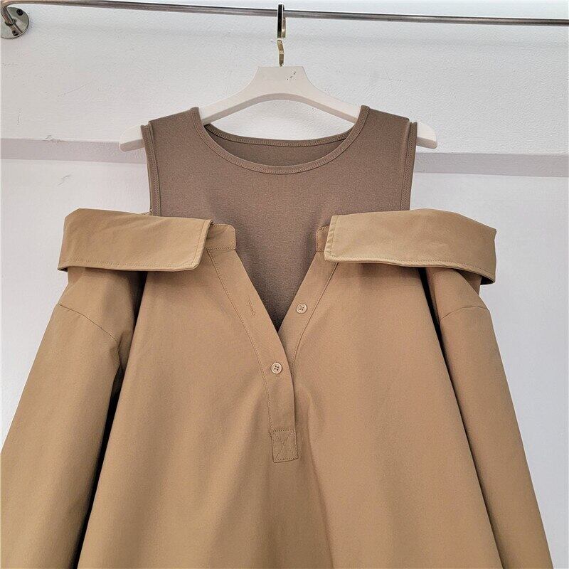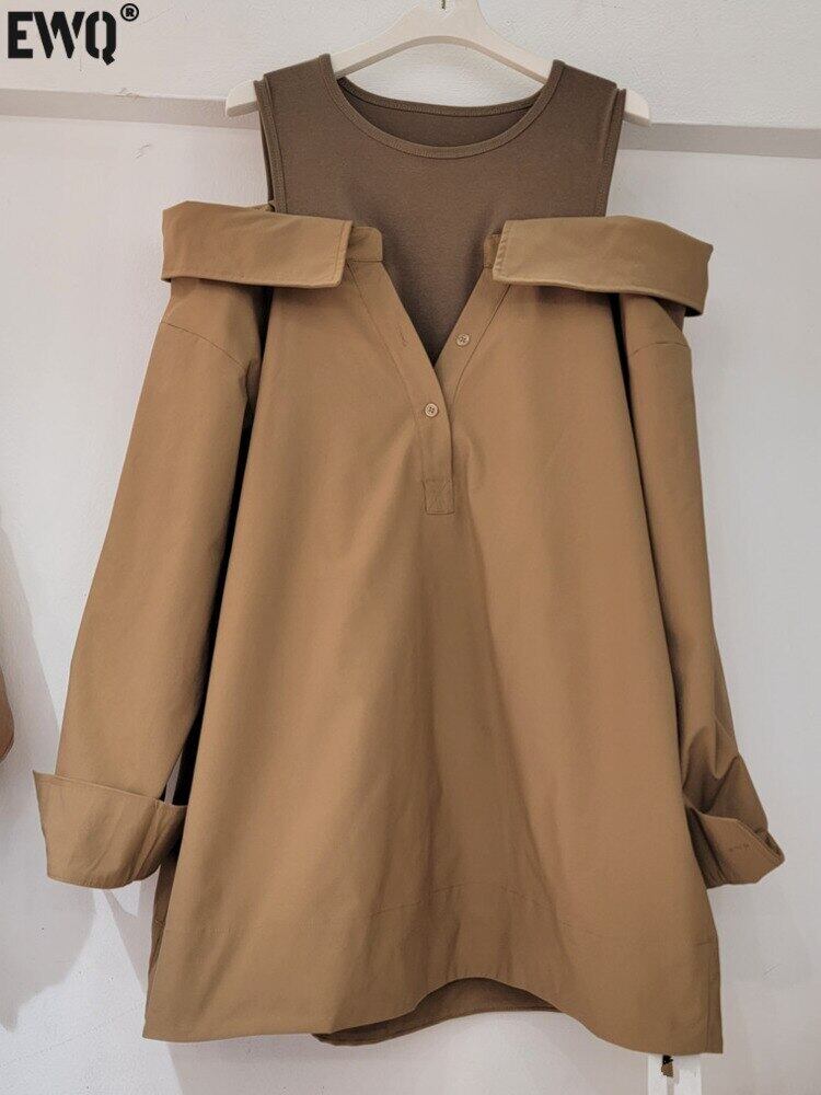 [EWQ] フェイクツーピースオフショルダーシャツドレス長袖ルーズパッチワークドレス秋潮 Vestido 3475 ロング オータム 秋物