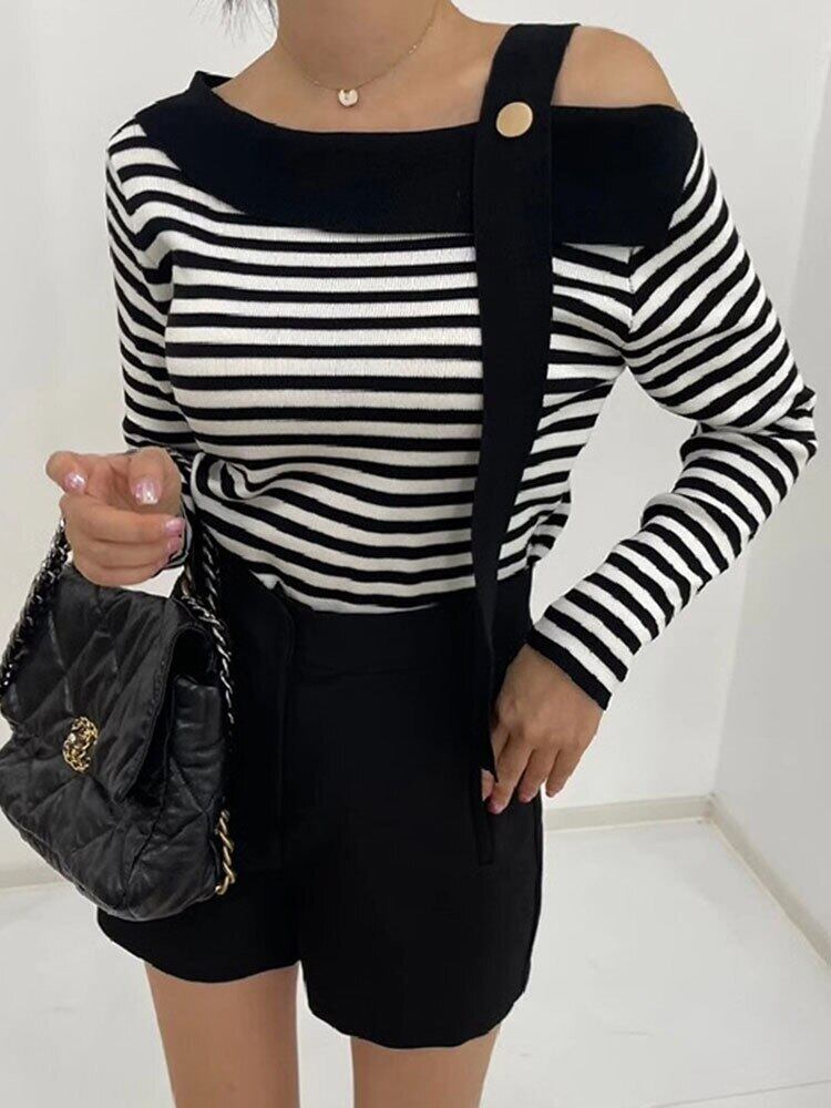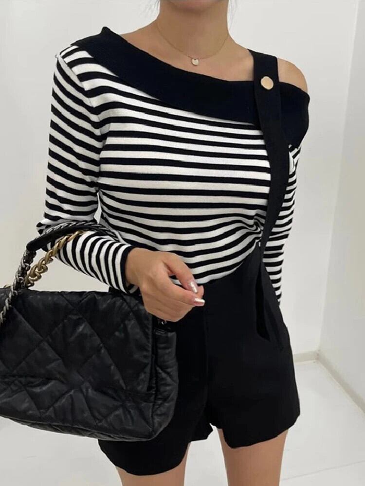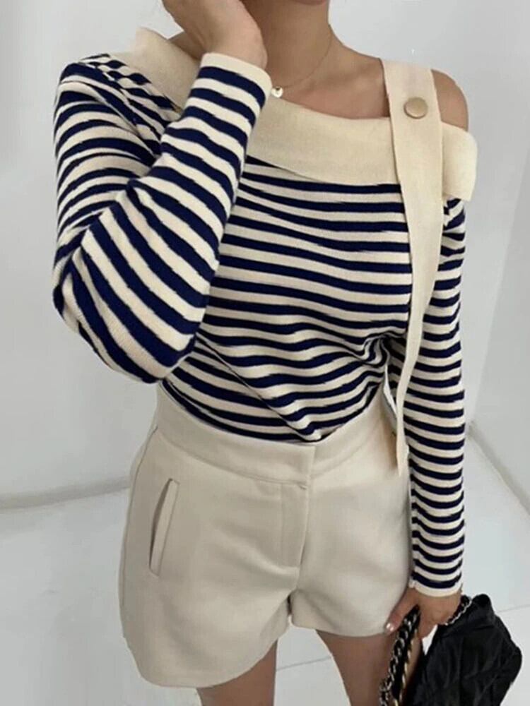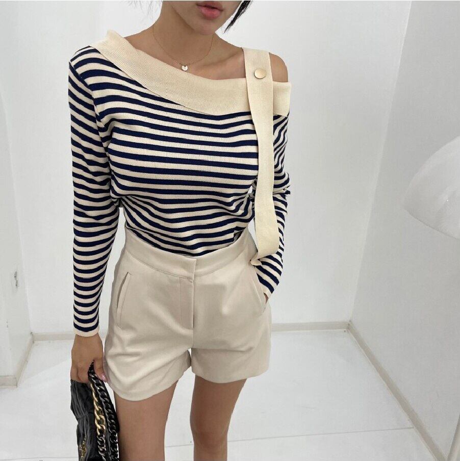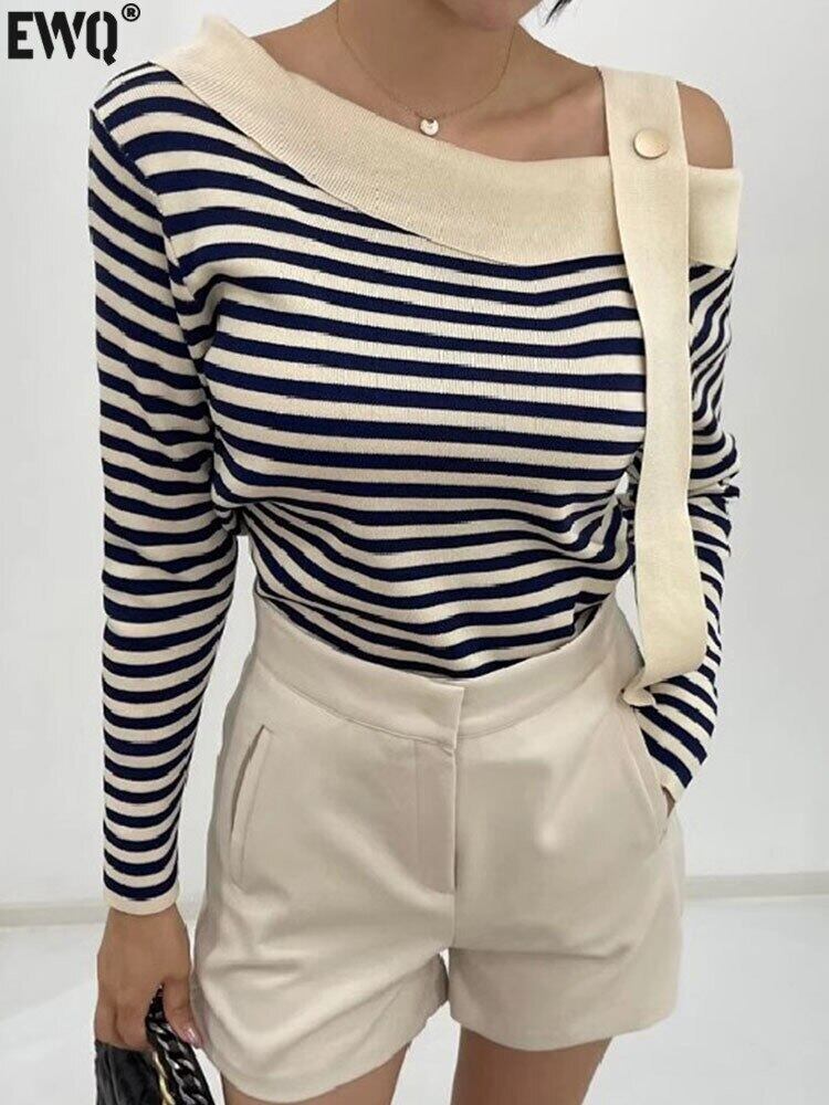[EWQ] シック斜め襟ストライプカラーコントラストスリムニットプルオーバー秋ニットトップス オータム 秋物