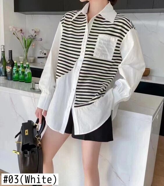 [EWQ] ストライプ パッチワーク コントラスト シャツ レディース 長袖 ポケット スプライス ゆったり 秋冬 16U4068 ロング オータム 秋物 ウィンター 冬物