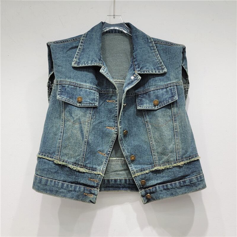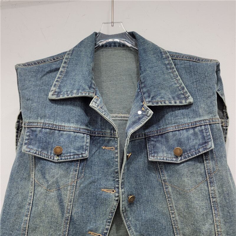 [EWQ] ショルダーパッドデニムベストストリートバリパッチワークシングルブレストノースリーブジャケット秋潮トップス オータム 秋物