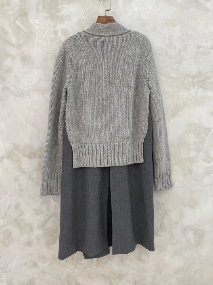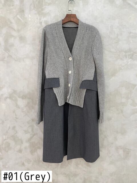 [EWQ] 長袖パッチワークグレーコート V ネックシングルブレストニットカーディガン秋服 ロング オータム 秋物 Vネック