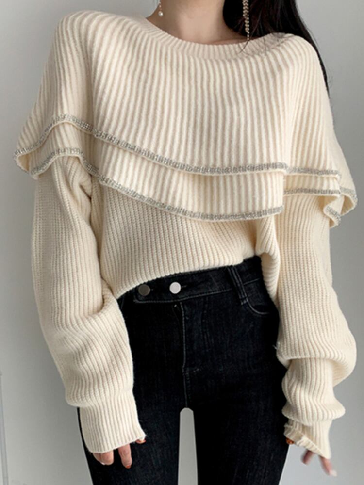[EWQ] O ネックパッチワークダブルフリルセーター長袖ルーズプルオーバーニット秋潮ニットトップ ロング オータム 秋物 Oネック