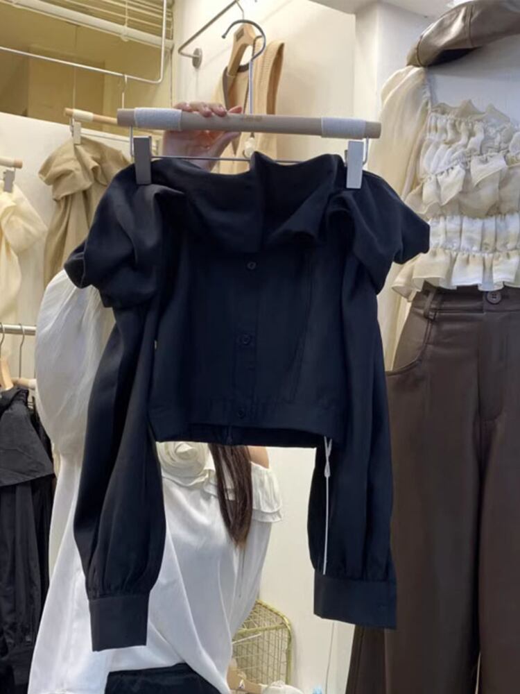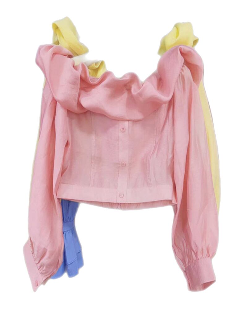 [EWQ] オフショルダー フリル パッチワーク ホワイト シャツ セクシー長袖シングルブレスト ピンク 秋冬 6U3953 ロング オータム 秋物 ウィンター 冬物