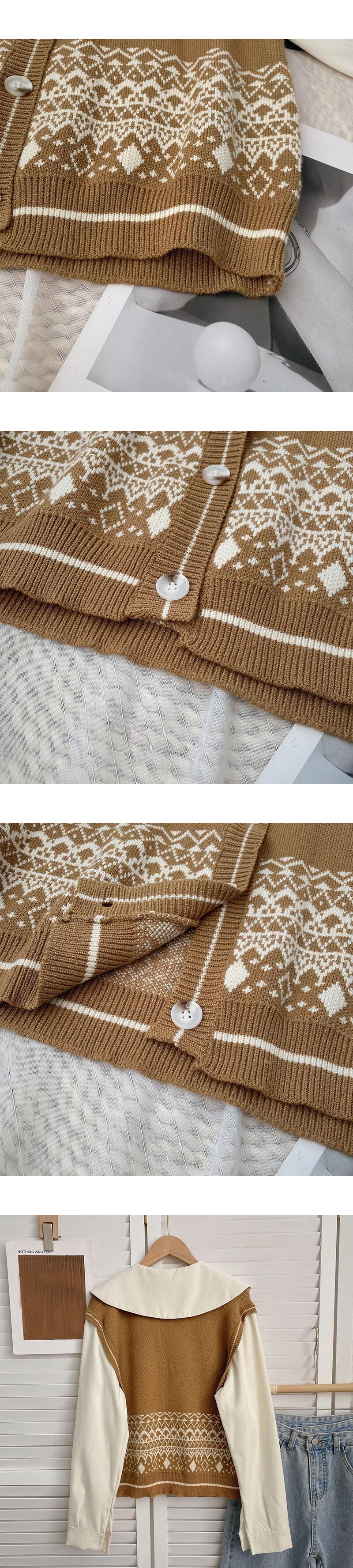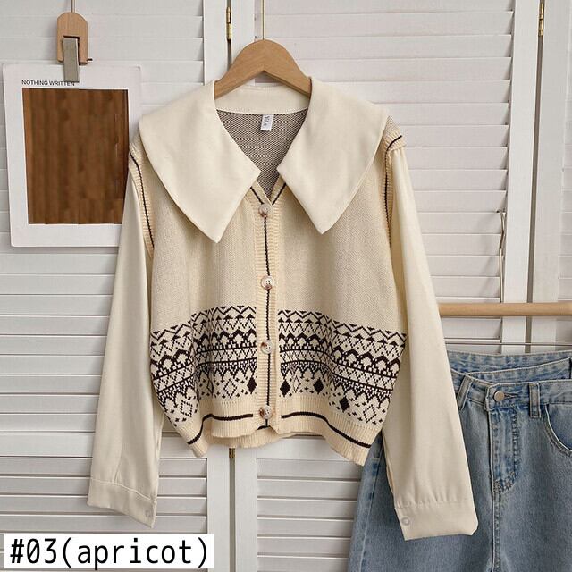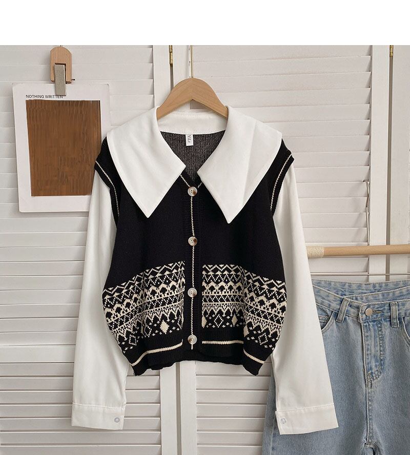 [EWQ] フェイク 2 ピース ニット パッチワーク シャツ長袖シングルブレスト プリント ルーズ秋潮トップス ロング オータム 秋物