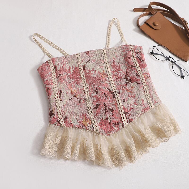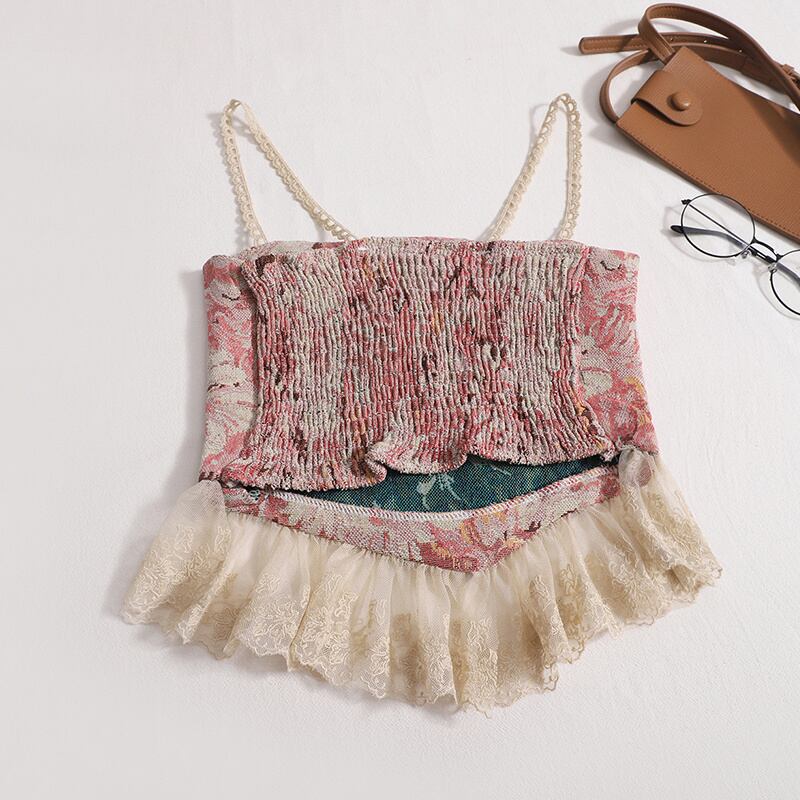 [EWQ] レース スプライス スリム フィット ユニーク トップ 油絵 フラグメント フラワー ストラップ タンクトップ 秋 16O02511 オータム 秋物 フラワーデザイン