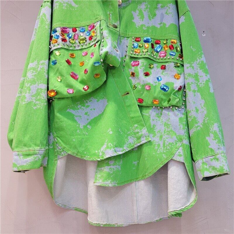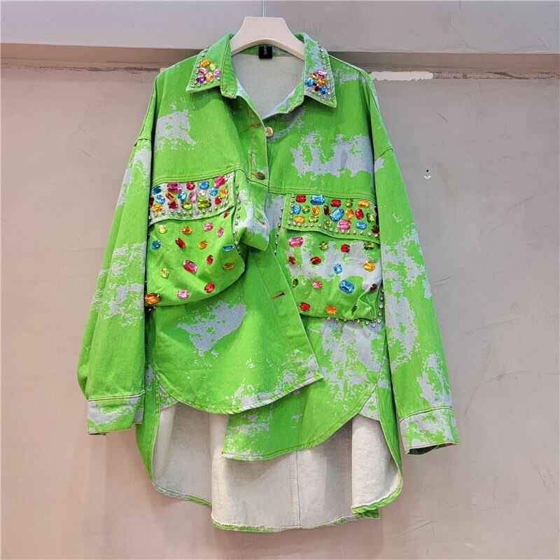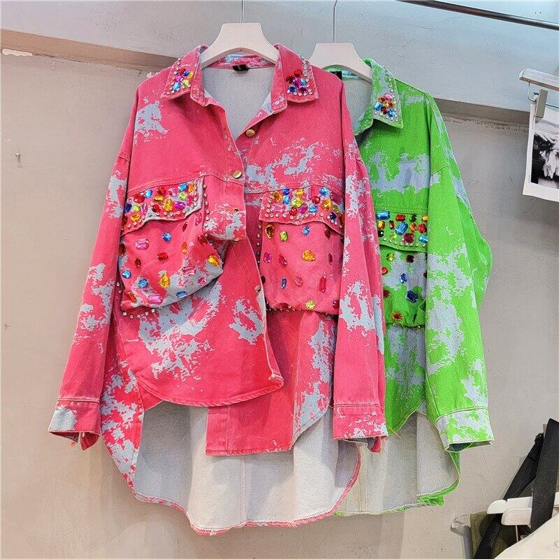 [EWQ] タイダイカラフルデニムシャツビーズダイヤモンド潮長袖不規則ストリートウェア秋トップ 27 ロング オータム 秋物