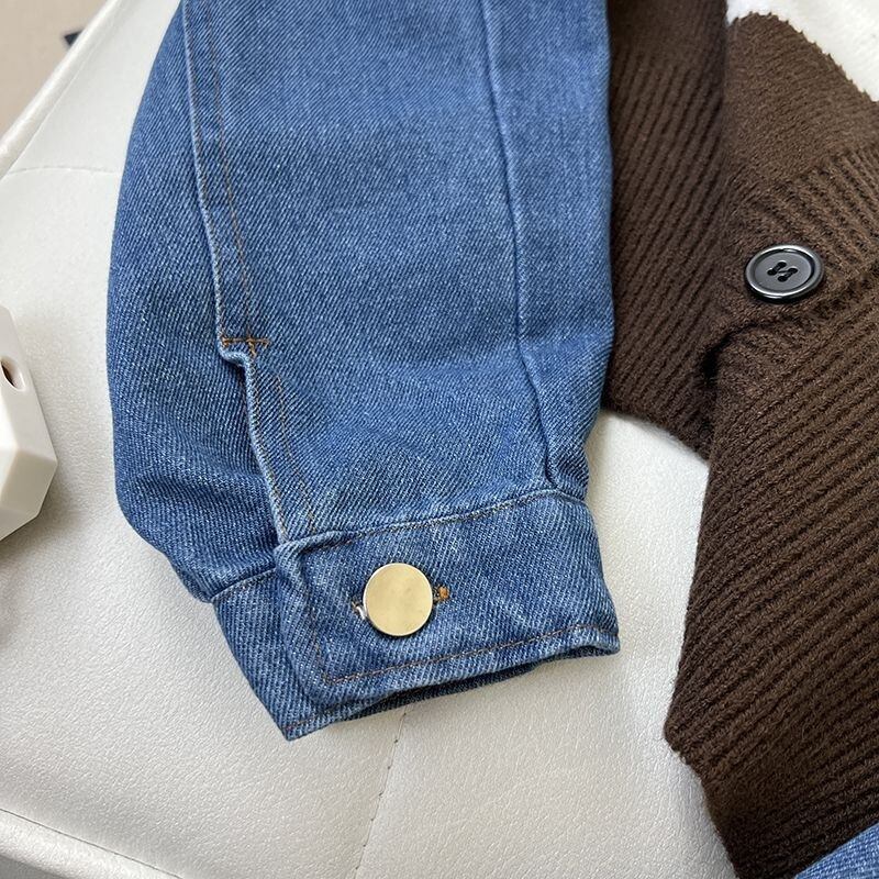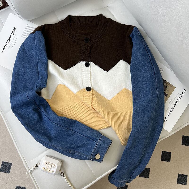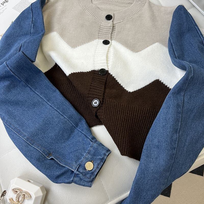 [EWQ] フェイク 2 ピースデニムスプライスカーディガンコートコントラストビッグサイズソフトシングルブレストセータージャケット秋潮 オータム 秋物