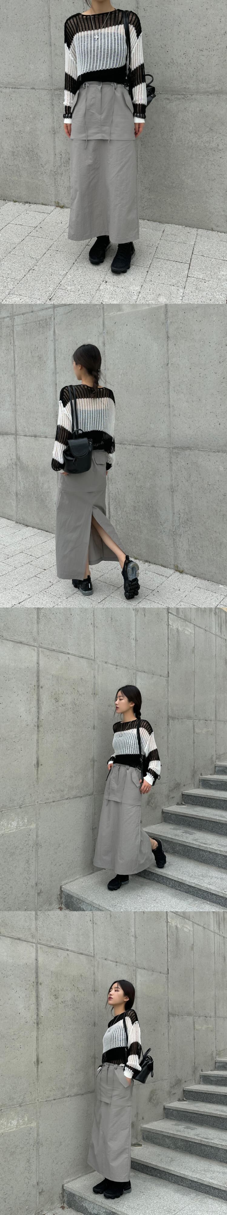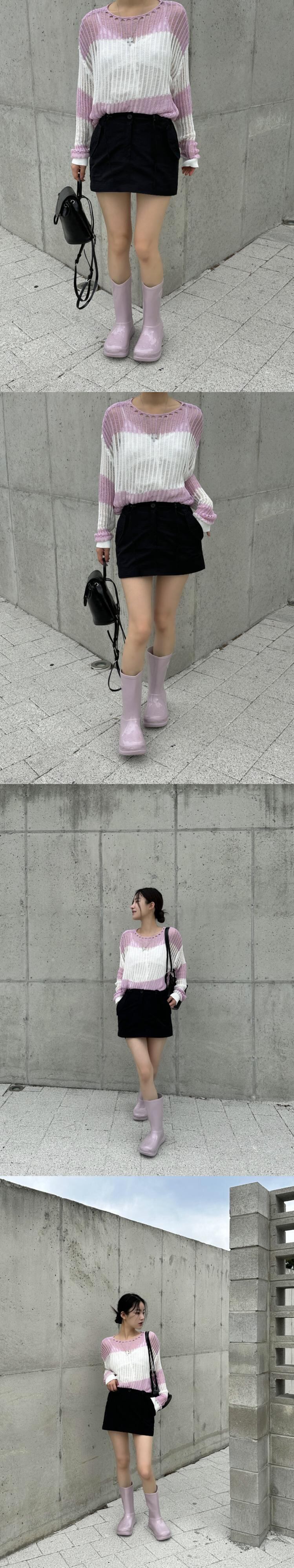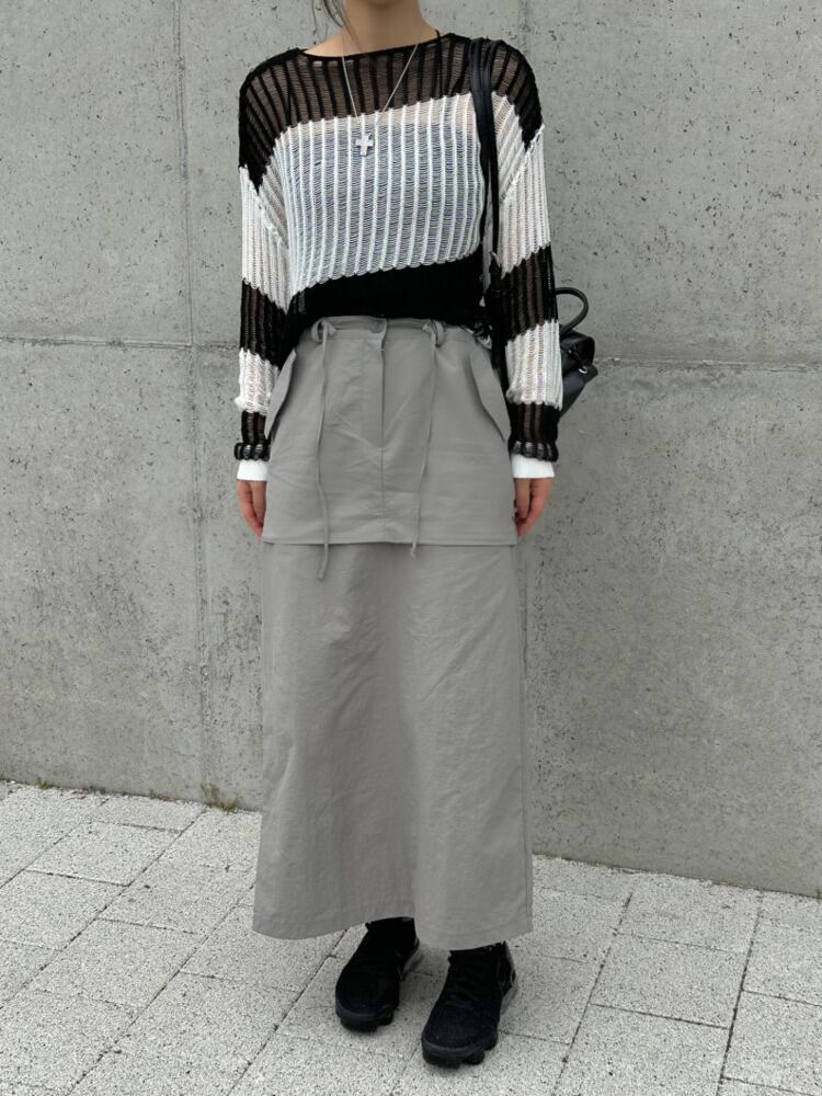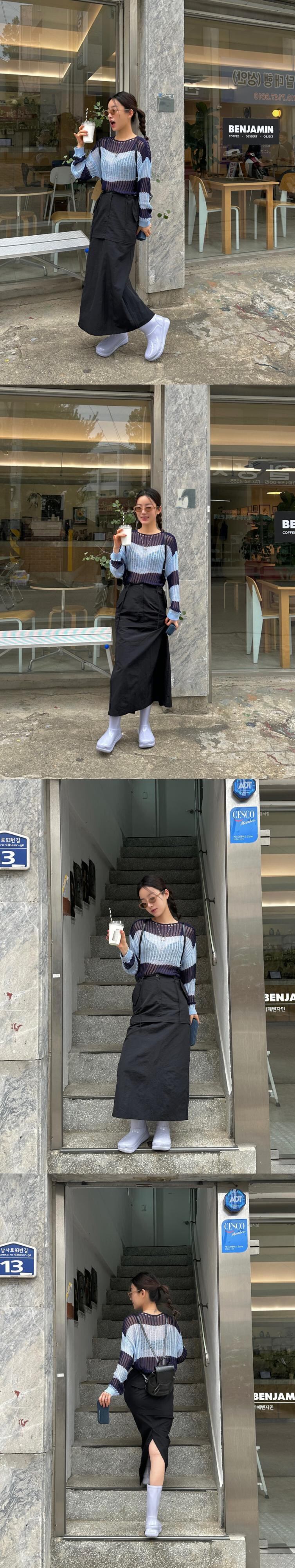 [EWQ] ストライプコントラストカラー中空ニットシャツ O ネック長袖ルーズプルオーバー秋 ロング オータム 秋物 Oネック