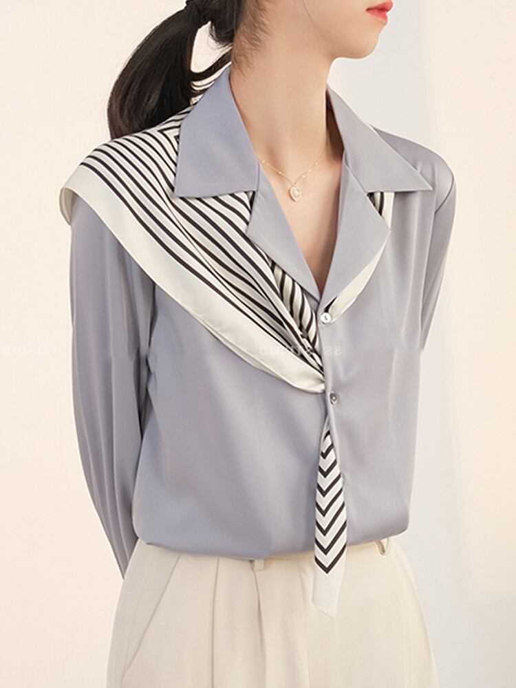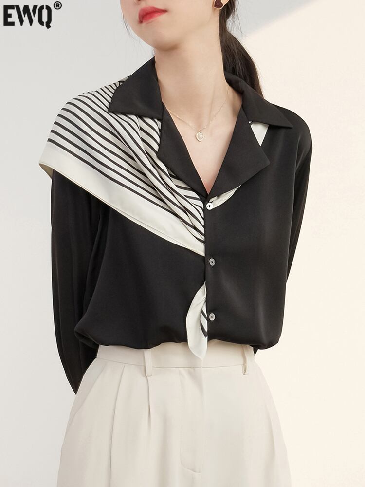 [EWQ] レディース パッチワーク ノッチ シャツ 長袖 シングルブレスト 秋潮トップ 16U2204 ロング オータム 秋物