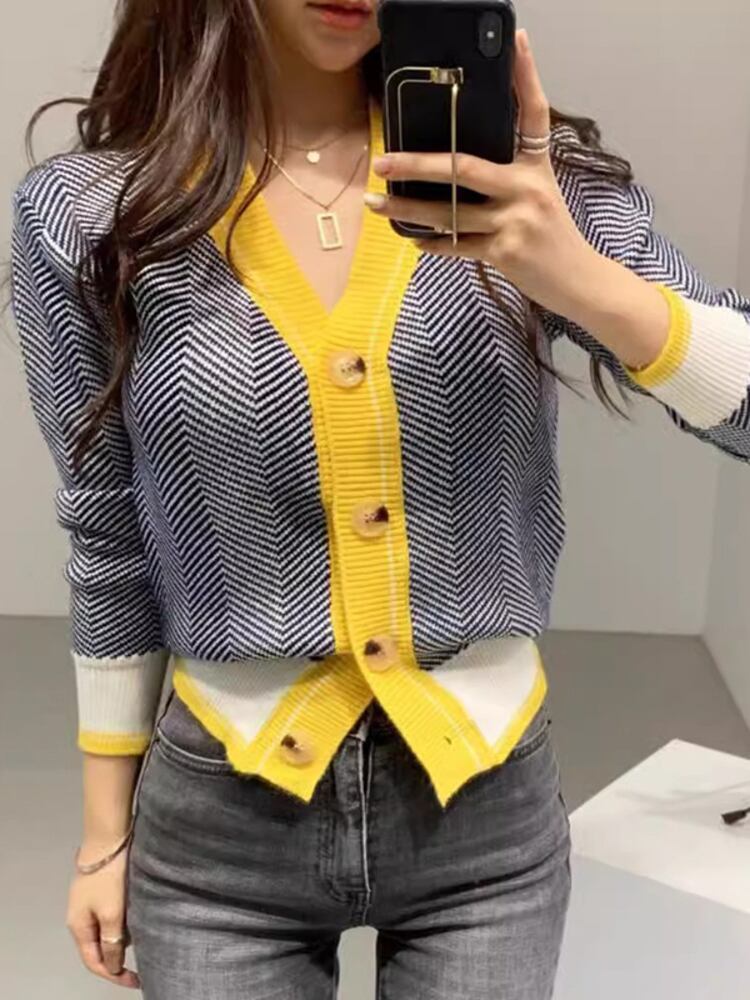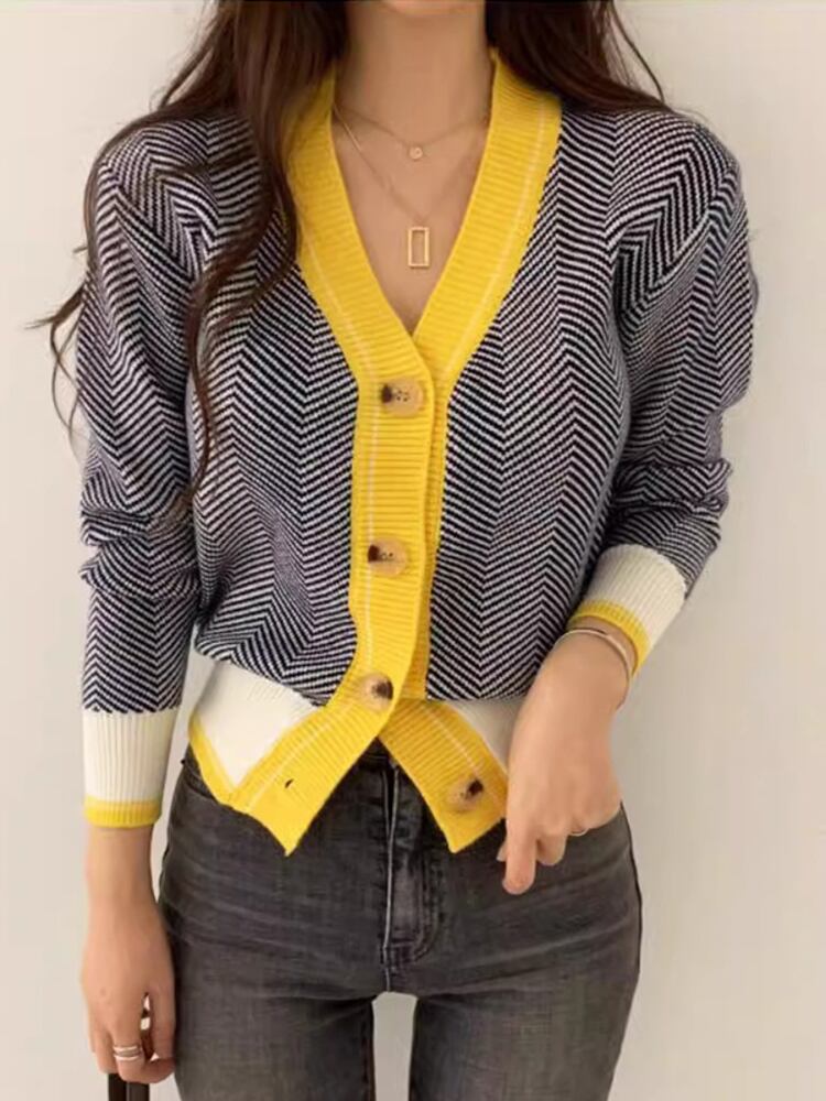 [EWQ] V ネックコントラストカラーカーディガンコートシングルブレスト弾性ショートセータージャケット秋潮 6U3884 エラスティック 伸縮 オータム 秋物 Vネック