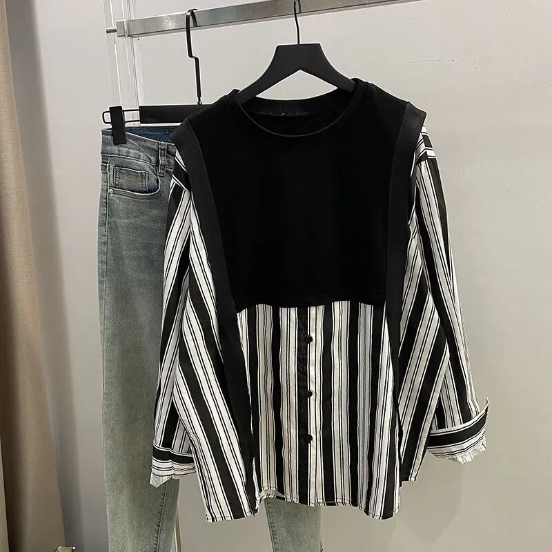 [EWQ]シックニットパッチワークレディース秋長袖Oネックカーキストライプシャツ大きいサイズブラウス16U4060 ロング オータム 秋物