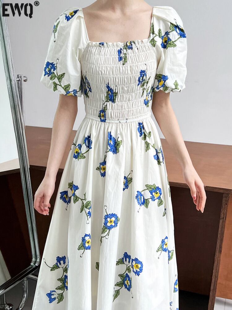 [EWQ] プリントドレス弾性ウエストバックレースアップスクエアネックドレス夏潮パーティー Vestido エラスティック 伸縮 サマー 夏物 スクウェア