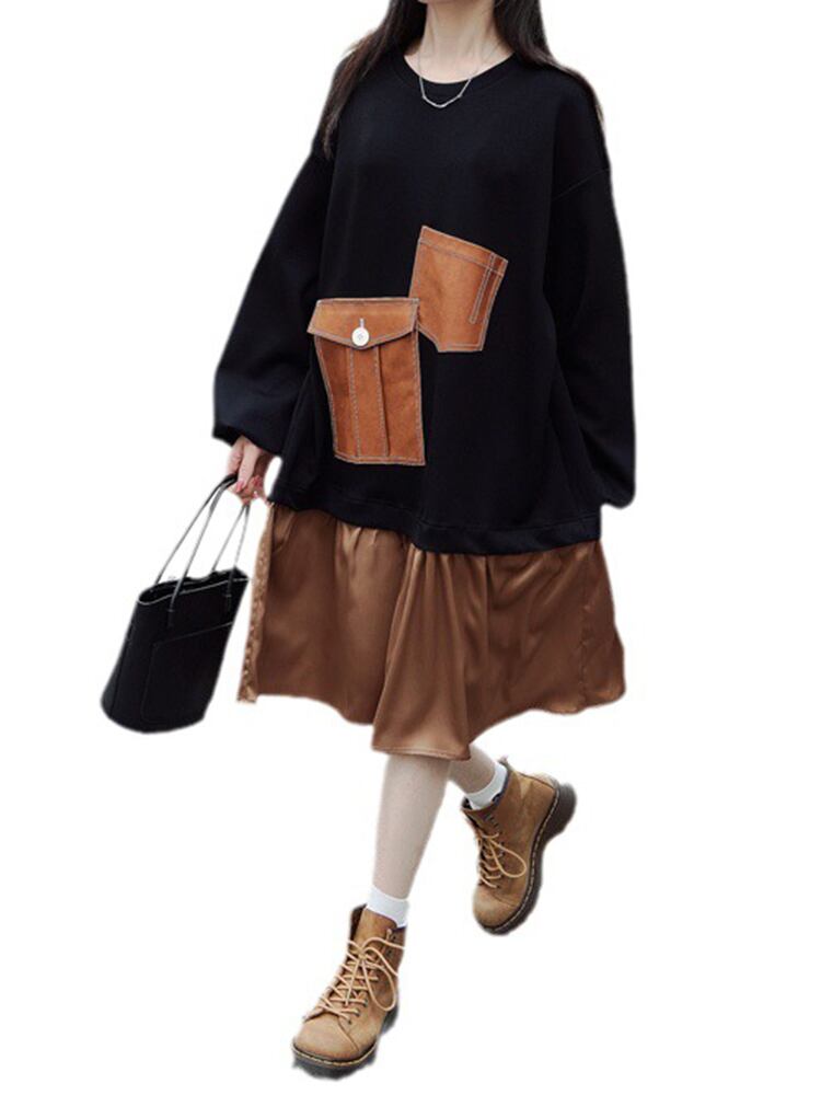 [EWQ] PU レザーポケットパッチワークスウェットシャツドレスビッグサイズ長袖ドレス秋潮 Vestido ロング オータム 秋物
