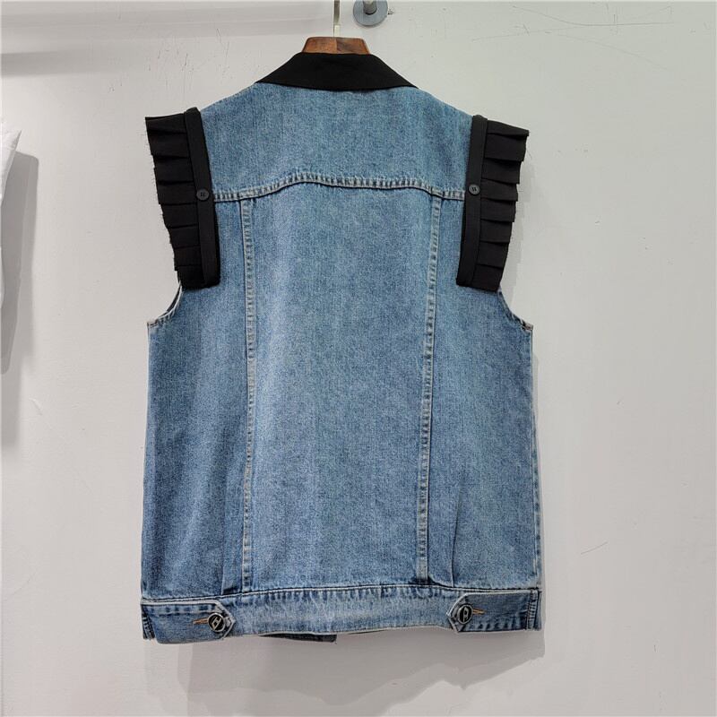 [EWQ] ノースリーブ ジャケット ゆったり アウター ブラック ノッチカラー レディース チョッキ デニム ベスト オールマッチ トップス 秋 オータム 秋物