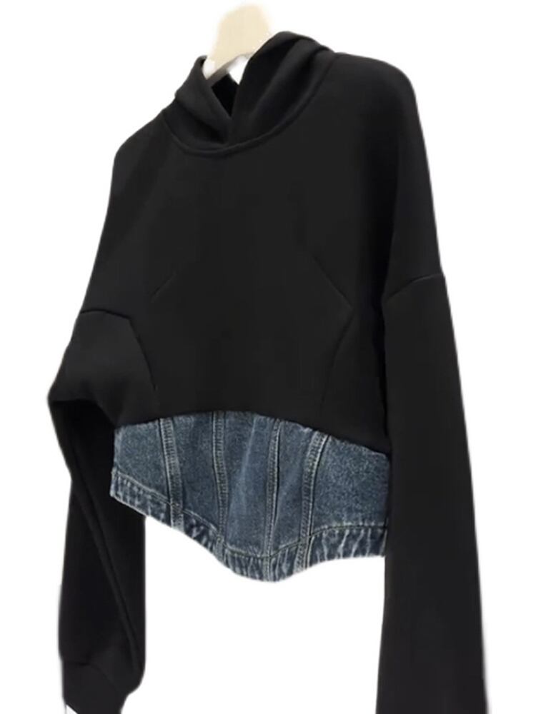 [EWQ] デニム不規則パッチワーク フード付きスウェット レディース 長袖 ルーズ プルオーバー トップス 秋冬 16U4475 ロング シャツ オータム 秋物 ウィンター 冬物